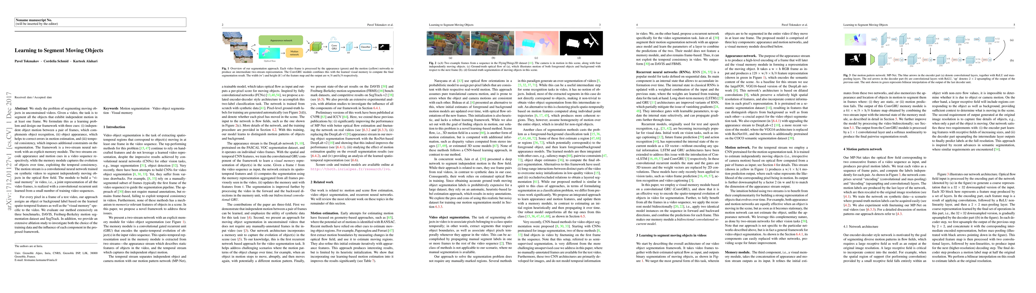 This paper proposes a framework for segmenting moving objects in unconstrained videos using a two-stream neural network with an explicit memory module. The approach integrates independent motion, appearance, and temporal consistency cues to accurately label pixels in test videos, evaluated on three benchmarks and supplemented by an ablation study.