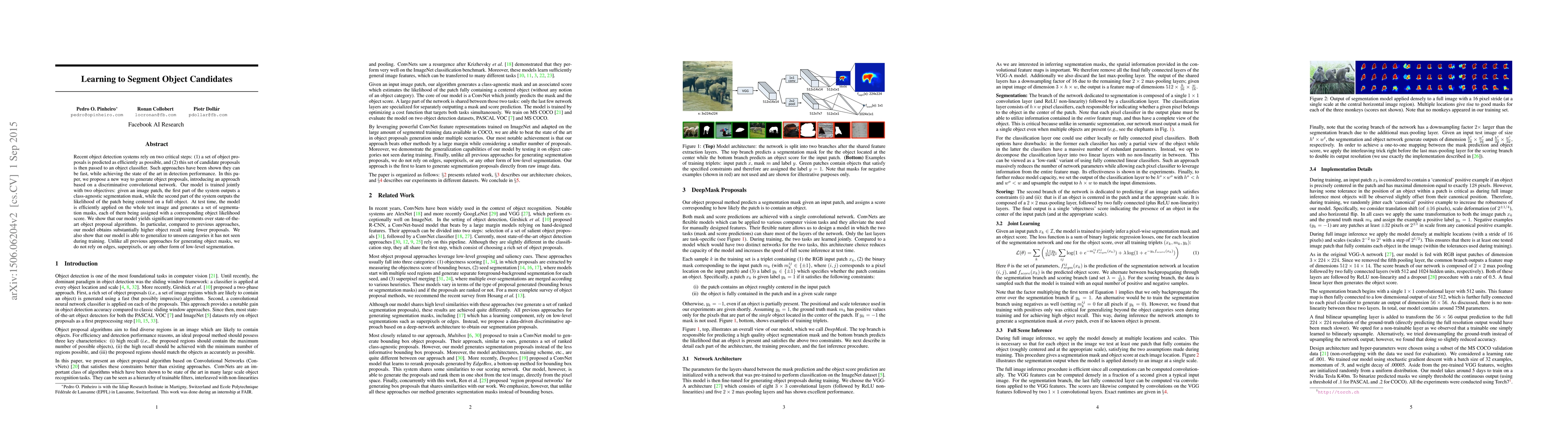 Recent object detection systems rely on two critical steps: (1) a set of object proposals is predicted as efficiently as possible, and (2) this set of candidate proposals is then passed to an object classifier. Such approaches have been shown they can be fast, while achieving the state of the art in detection performance. In this paper, we propose a new way to generate object proposals, introducing an approach based on a discriminative convolutional network. Our model is trained jointly with two objectives: given an image patch, the first part of the system outputs a class-agnostic segmentation mask, while the second part of the system outputs the likelihood of the patch being centered on a full object. At test time, the model is efficiently applied on the whole test image and generates a set of segmentation masks, each of them being assigned with a corresponding object likelihood score. We show that our model yields significant improvements over state-of-the-art object proposal algorithms. In particular, compared to previous approaches, our model obtains substantially higher object recall using fewer proposals. We also show that our model is able to generalize to unseen categories it has not seen during training. Unlike all previous approaches for generating object masks, we do not rely on edges, superpixels, or any other form of low-level segmentation.