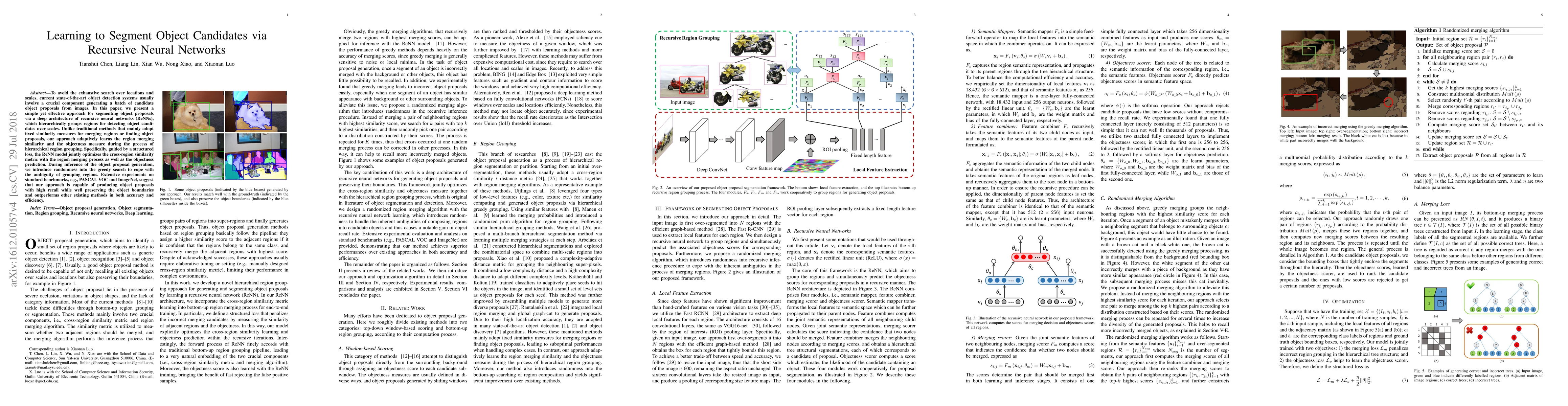 To avoid the exhaustive search over locations and scales, current state-of-the-art object detection systems usually involve a crucial component generating a batch of candidate object proposals from images. In this paper, we present a simple yet effective approach for segmenting object proposals via a deep architecture of recursive neural networks (ReNNs), which hierarchically groups regions for detecting object candidates over scales. Unlike traditional methods that mainly adopt fixed similarity measures for merging regions or finding object proposals, our approach adaptively learns the region merging similarity and the objectness measure during the process of hierarchical region grouping. Specifically, guided by a structured loss, the ReNN model jointly optimizes the cross-region similarity metric with the region merging process as well as the objectness prediction. During inference of the object proposal generation, we introduce randomness into the greedy search to cope with the ambiguity of grouping regions. Extensive experiments on standard benchmarks, e.g., PASCAL VOC and ImageNet, suggest that our approach is capable of producing object proposals with high recall while well preserving the object boundaries and outperforms other existing methods in both accuracy and efficiency.