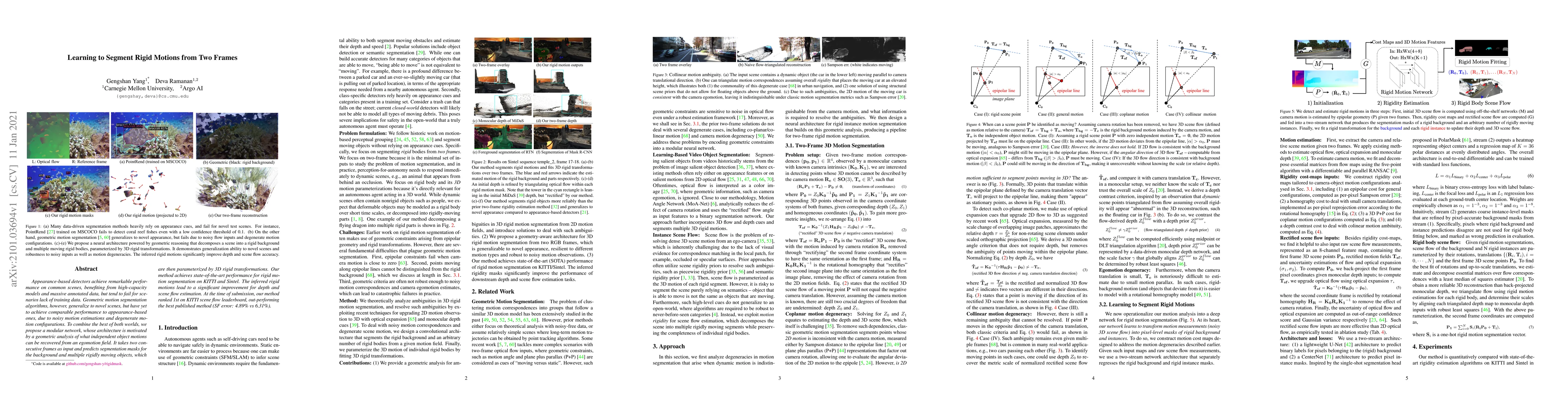 This paper proposes a modular network to segment rigid motions from two consecutive frames, combining the strengths of appearance-based and geometric motion segmentation. The method achieves state-of-the-art performance on KITTI and Sintel datasets, significantly improving depth and scene flow estimation.