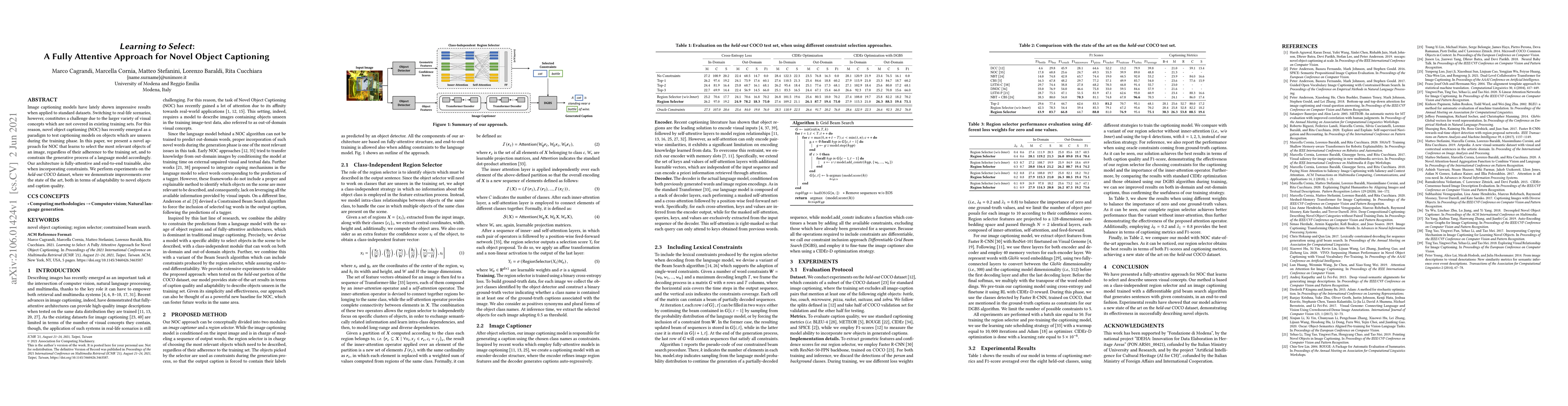 Image captioning models have lately shown impressive results when applied to standard datasets. Switching to real-life scenarios, however, constitutes a challenge due to the larger variety of visual concepts which are not covered in existing training sets. For this reason, novel object captioning (NOC) has recently emerged as a paradigm to test captioning models on objects which are unseen during the training phase. In this paper, we present a novel approach for NOC that learns to select the most relevant objects of an image, regardless of their adherence to the training set, and to constrain the generative process of a language model accordingly. Our architecture is fully-attentive and end-to-end trainable, also when incorporating constraints. We perform experiments on the held-out COCO dataset, where we demonstrate improvements over the state of the art, both in terms of adaptability to novel objects and caption quality.