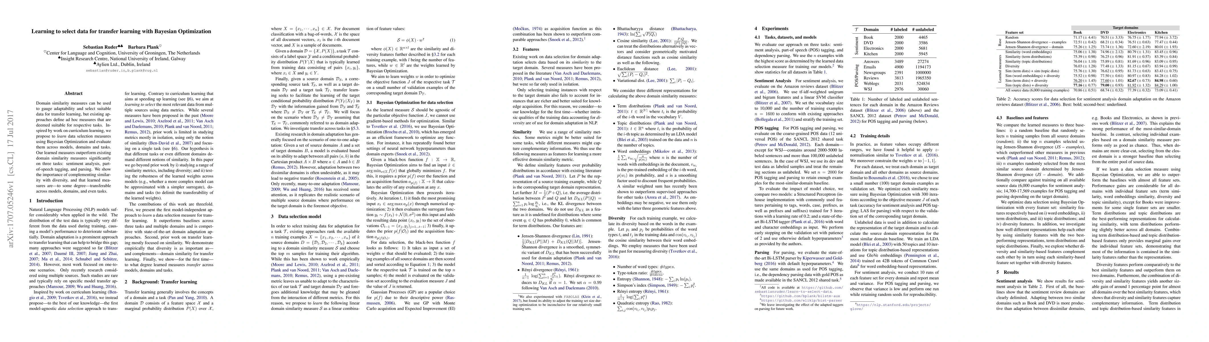 Domain similarity measures can be used to gauge adaptability and select suitable data for transfer learning, but existing approaches define ad hoc measures that are deemed suitable for respective tasks. Inspired by work on curriculum learning, we propose to \emph{learn} data selection measures using Bayesian Optimization and evaluate them across models, domains and tasks. Our learned measures outperform existing domain similarity measures significantly on three tasks: sentiment analysis, part-of-speech tagging, and parsing. We show the importance of complementing similarity with diversity, and that learned measures are -- to some degree -- transferable across models, domains, and even tasks.