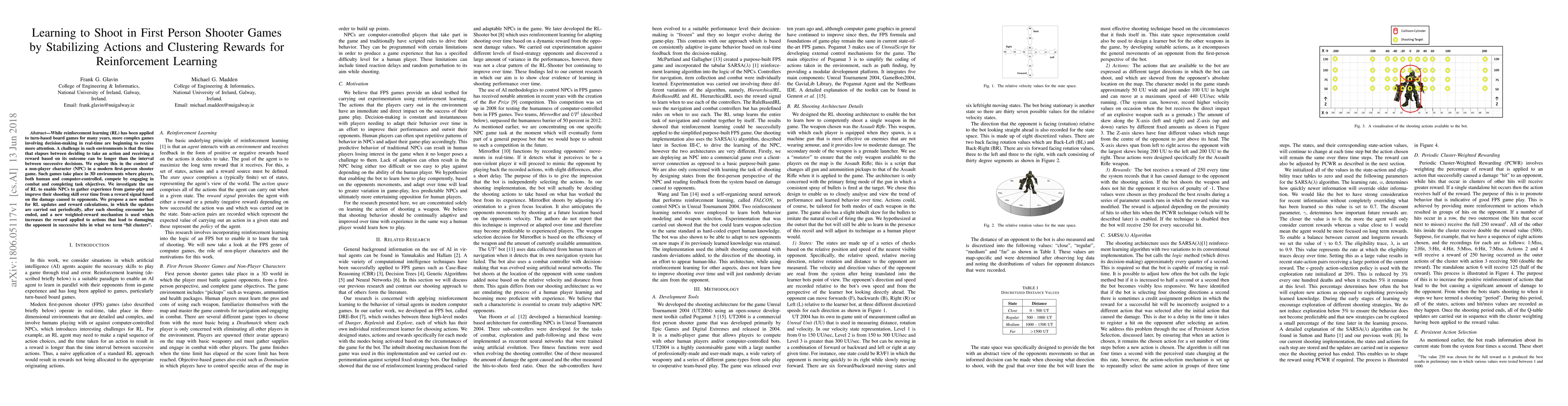 This paper explores reinforcement learning (RL) to improve NPCs' shooting skills in first-person shooter games by stabilizing action updates and employing a new reward mechanism that clusters successive hits to enhance learning efficiency. The proposed method updates RL periodically after shooting encounters and rewards actions that form "hit clusters," improving NPC performance over time.