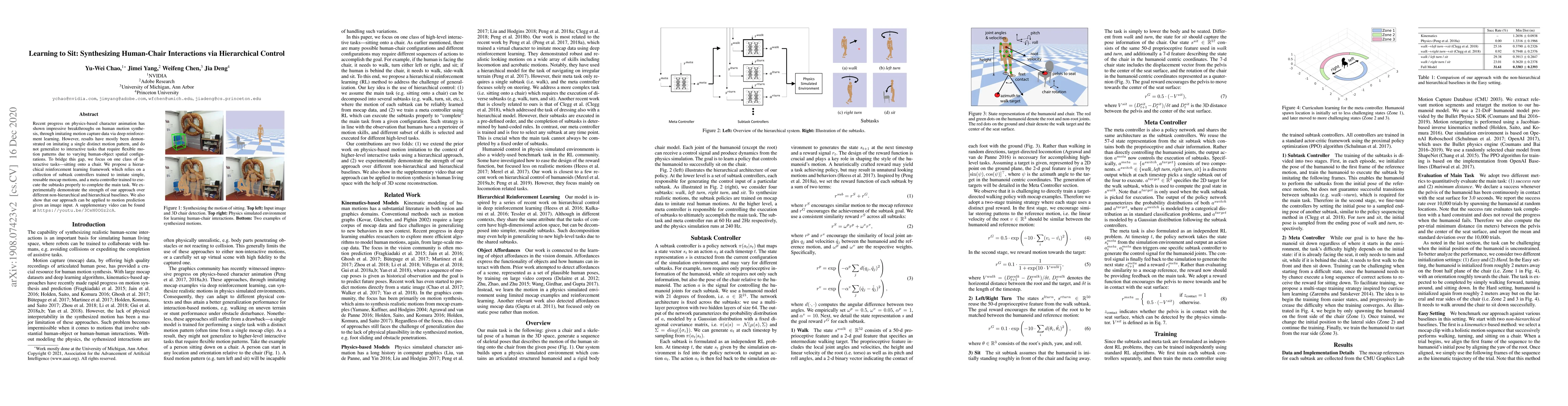 The paper proposes a hierarchical reinforcement learning framework for synthesizing human-chair interactions, specifically the task of sitting down. This framework consists of subtask controllers trained to imitate simple motions from motion capture (mocap) data and a meta controller to execute these subtasks properly to complete the main task.