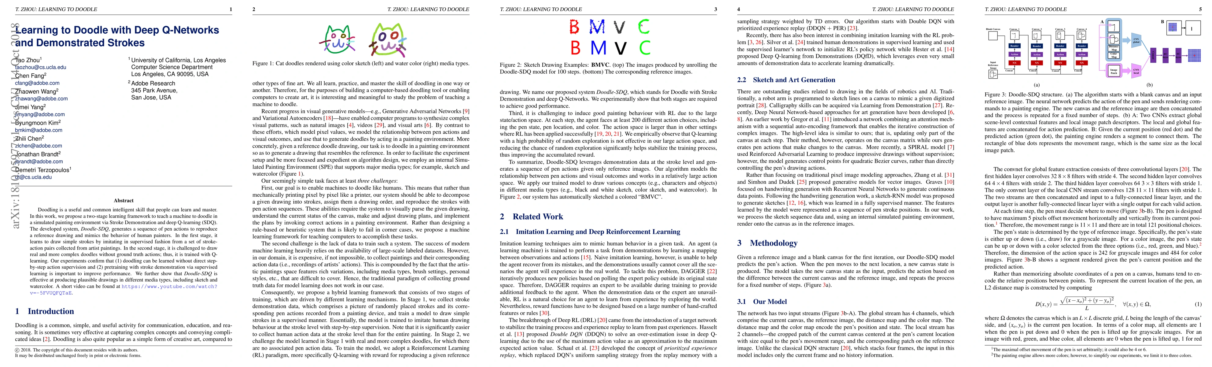 A new AI system called Doodle-SDQ learns to doodle by imitating human strokes in a simulated environment, achieving effective results with minimal supervision. Pretraining with stroke demonstration improves performance, enabling the system to produce plausible drawings in various media types.