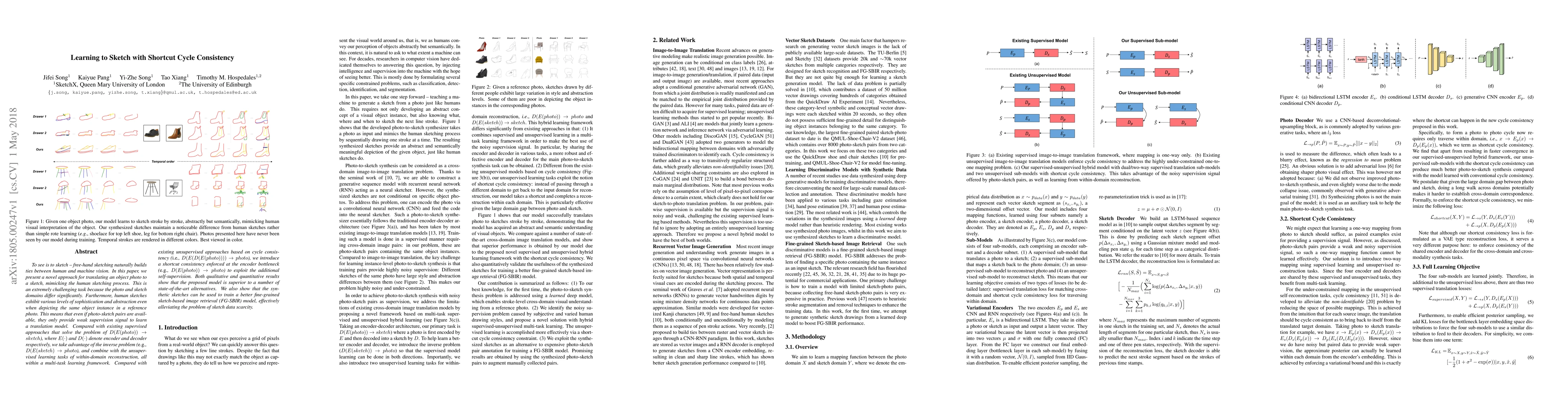 To see is to sketch -- free-hand sketching naturally builds ties between human and machine vision. In this paper, we present a novel approach for translating an object photo to a sketch, mimicking the human sketching process. This is an extremely challenging task because the photo and sketch domains differ significantly. Furthermore, human sketches exhibit various levels of sophistication and abstraction even when depicting the same object instance in a reference photo. This means that even if photo-sketch pairs are available, they only provide weak supervision signal to learn a translation model. Compared with existing supervised approaches that solve the problem of D(E(photo)) -> sketch, where E($\cdot$) and D($\cdot$) denote encoder and decoder respectively, we take advantage of the inverse problem (e.g., D(E(sketch)) -> photo), and combine with the unsupervised learning tasks of within-domain reconstruction, all within a multi-task learning framework. Compared with existing unsupervised approaches based on cycle consistency (i.e., D(E(D(E(photo)))) -> photo), we introduce a shortcut consistency enforced at the encoder bottleneck (e.g., D(E(photo)) -> photo) to exploit the additional self-supervision. Both qualitative and quantitative results show that the proposed model is superior to a number of state-of-the-art alternatives. We also show that the synthetic sketches can be used to train a better fine-grained sketch-based image retrieval (FG-SBIR) model, effectively alleviating the problem of sketch data scarcity.