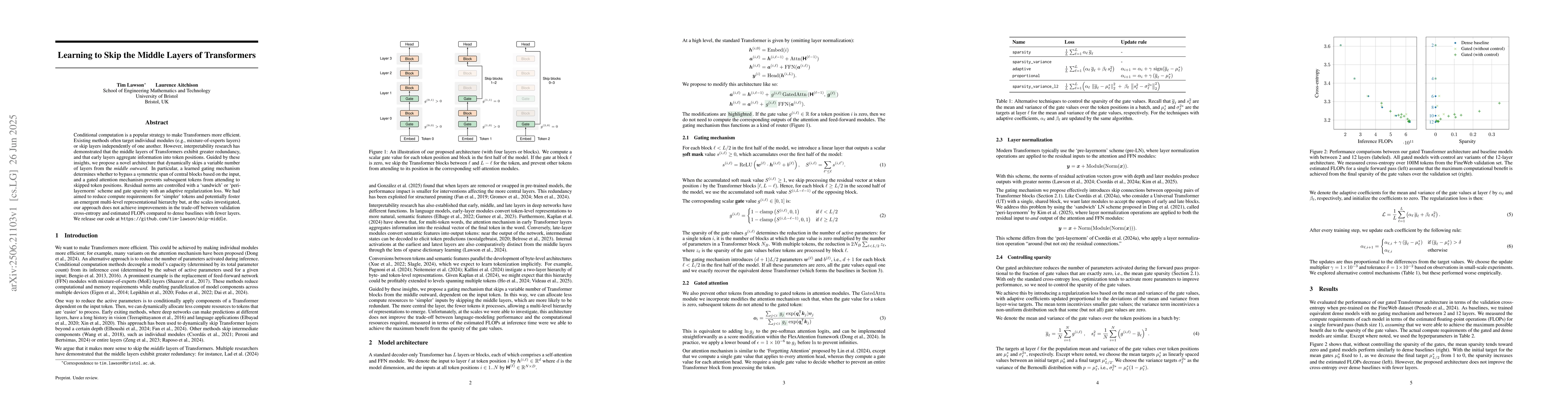 Conditional computation is a popular strategy to make Transformers more efficient. Existing methods often target individual modules (e.g., mixture-of-experts layers) or skip layers independently of one another. However, interpretability research has demonstrated that the middle layers of Transformers exhibit greater redundancy, and that early layers aggregate information into token positions. Guided by these insights, we propose a novel architecture that dynamically skips a variable number of layers from the middle outward. In particular, a learned gating mechanism determines whether to bypass a symmetric span of central blocks based on the input, and a gated attention mechanism prevents subsequent tokens from attending to skipped token positions. Residual norms are controlled with a 'sandwich' or 'perilayernorm' scheme and gate sparsity with an adaptive regularization loss. We had aimed to reduce compute requirements for 'simpler' tokens and potentially foster an emergent multi-level representational hierarchy but, at the scales investigated, our approach does not achieve improvements in the trade-off between validation cross-entropy and estimated FLOPs compared to dense baselines with fewer layers. We release our code at https://github.com/tim-lawson/skip-middle.