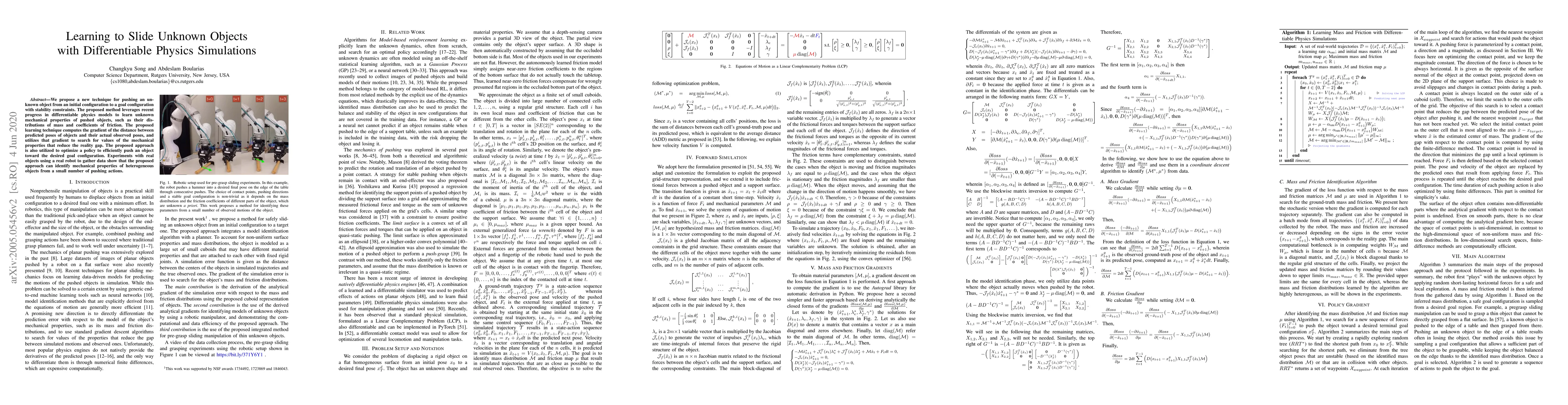 This paper introduces a novel technique using differentiable physics simulations to learn the mechanical properties of unknown objects, optimizing their push towards a goal configuration. The method reduces the reality gap by computing gradients between predicted and observed object poses, demonstrating effective identification of object properties from limited data.