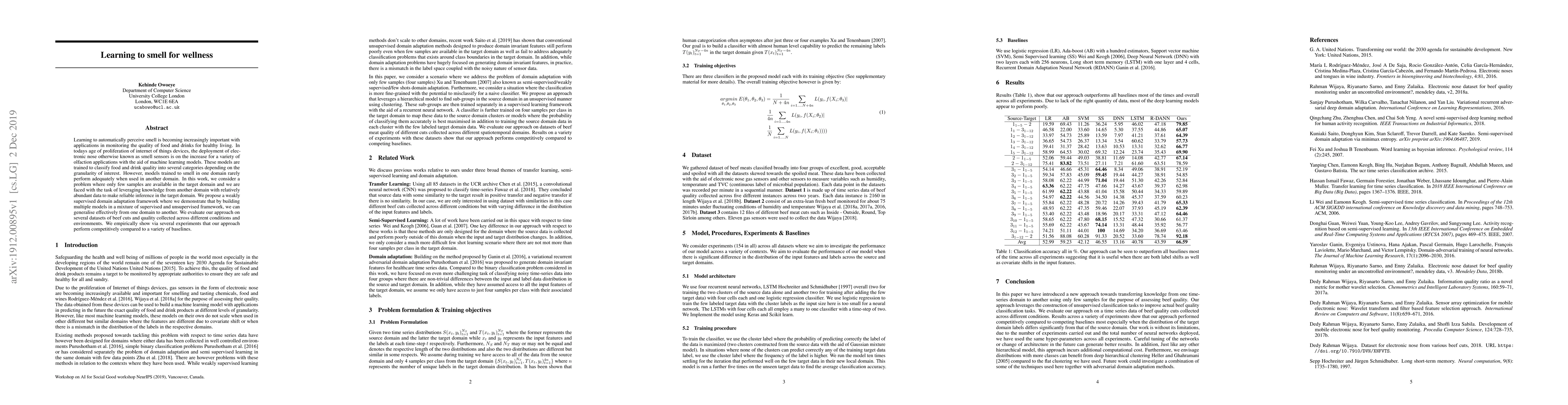 Learning to automatically perceive smell is becoming increasingly important with applications in monitoring the quality of food and drinks for healthy living. In todays age of proliferation of internet of things devices, the deployment of electronic nose otherwise known as smell sensors is on the increase for a variety of olfaction applications with the aid of machine learning models. These models are trained to classify food and drink quality into several categories depending on the granularity of interest. However, models trained to smell in one domain rarely perform adequately when used in another domain. In this work, we consider a problem where only few samples are available in the target domain and we are faced with the task of leveraging knowledge from another domain with relatively abundant data to make reliable inference in the target domain. We propose a weakly supervised domain adaptation framework where we demonstrate that by building multiple models in a mixture of supervised and unsupervised framework, we can generalise effectively from one domain to another. We evaluate our approach on several datasets of beef cuts and quality collected across different conditions and environments. We empirically show via several experiments that our approach perform competitively compared to a variety of baselines.