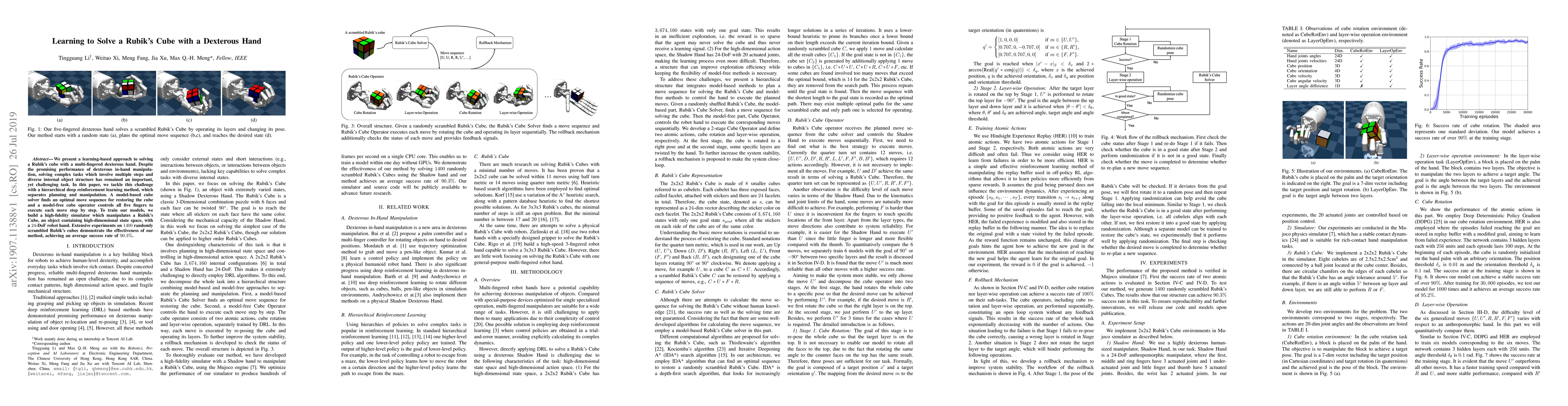 This paper introduces a hierarchical deep reinforcement learning method to solve a Rubik's Cube using a dexterous hand, separating planning from manipulation. The approach combines a model-based solver for optimal move sequences and a model-free operator for finger control, achieving a 90.3% success rate in simulations.