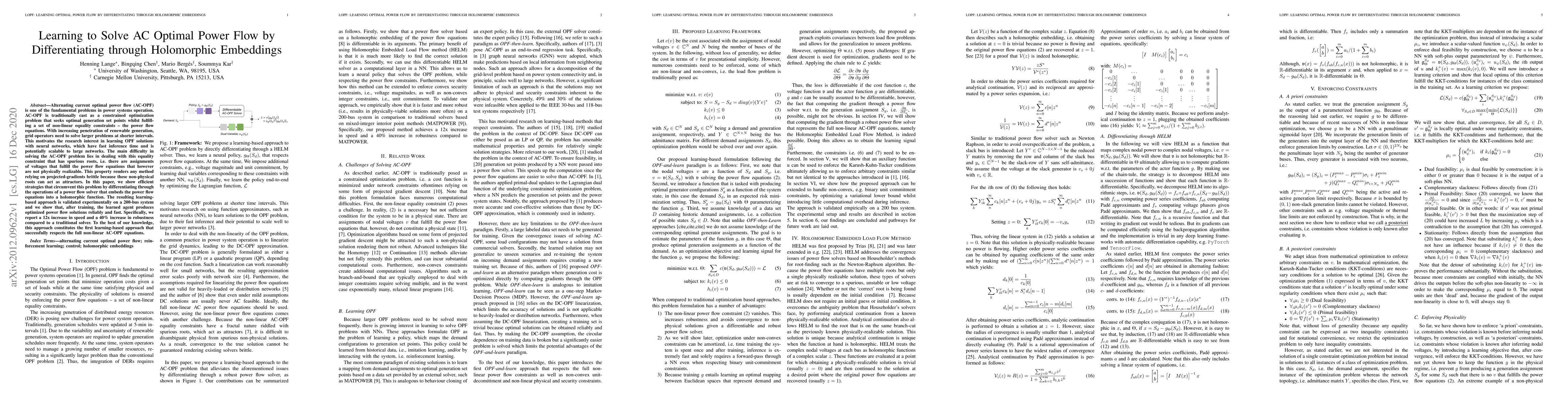 This paper proposes a novel learning-based method for solving AC Optimal Power Flow (OPF) problems using neural networks that differentiate through holomorphic embeddings of power flow equations. The method shows a 12x speed increase and 40% robustness improvement over traditional solvers in a 200-bus system, addressing the challenge of non-physical roots in power flow constraints.