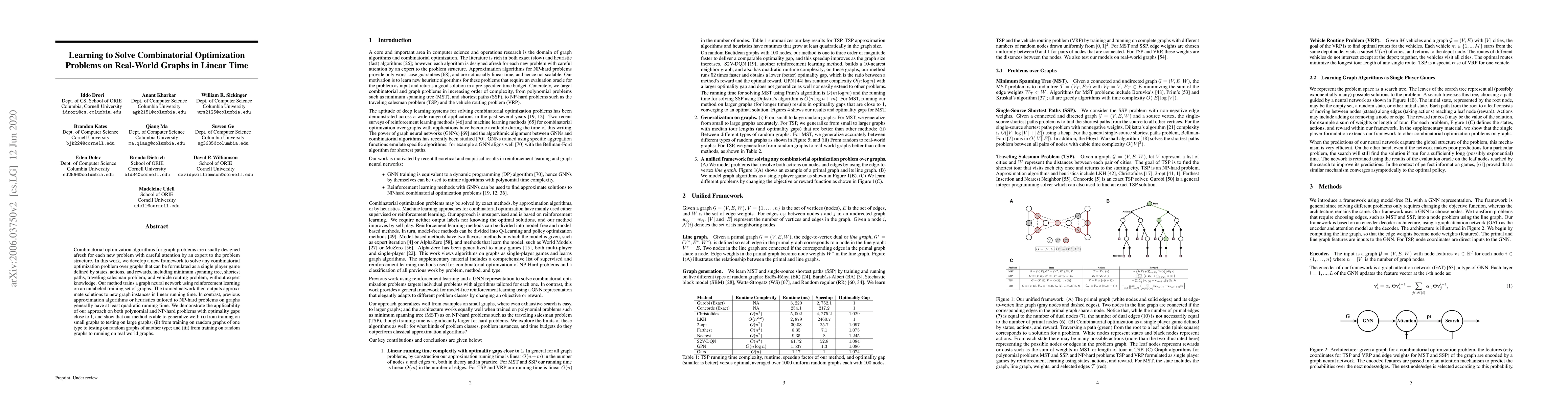 This paper introduces a framework that trains a graph neural network using reinforcement learning to solve various combinatorial optimization problems on graphs in linear time, without requiring expert knowledge. The method demonstrates strong generalization capabilities across different graph types and real-world instances.