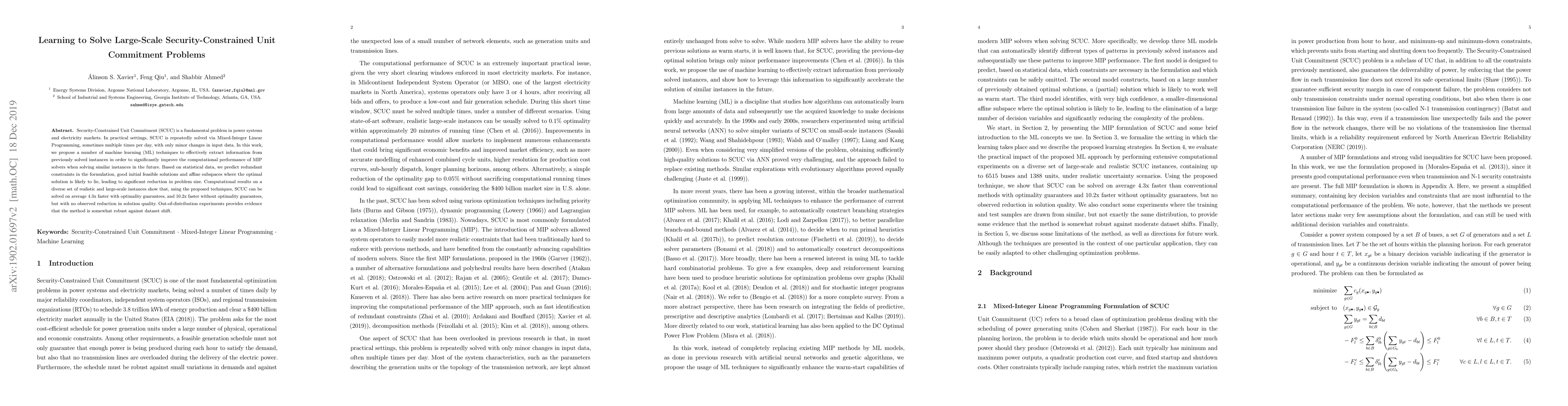 This paper proposes machine learning techniques to enhance the computational efficiency of solving large-scale Security-Constrained Unit Commitment problems by leveraging previously solved instances. The methods predict redundant constraints, good initial feasible solutions, and optimal solution subspaces, leading to significant reductions in problem size and average solution times of 4.3x with optimality guarantees and 10.2x without.