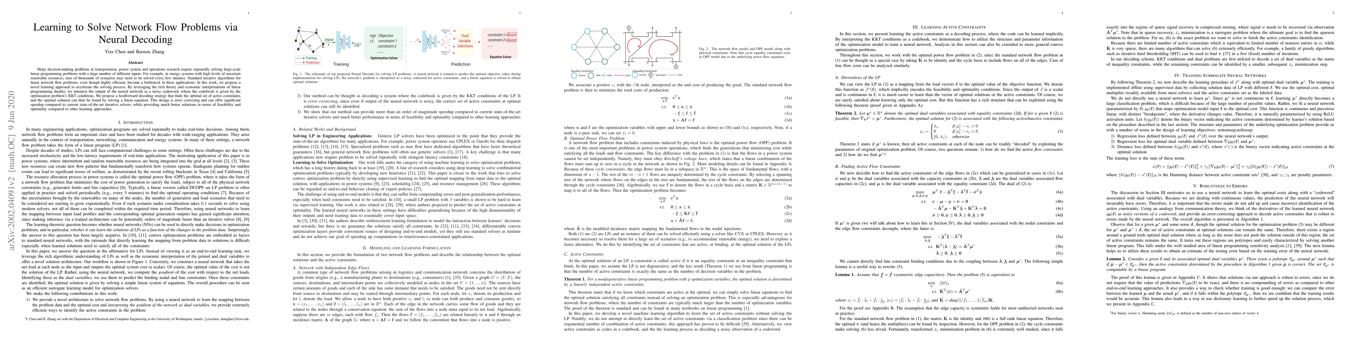 Many decision-making problems in engineering applications such as transportation, power system and operations research require repeatedly solving large-scale linear programming problems with a large number of different inputs. For example, in energy systems with high levels of uncertain renewable resources, tens of thousands of scenarios may need to be solved every few minutes. Standard iterative algorithms for linear network flow problems, even though highly efficient, becomes a bottleneck in these applications. In this work, we propose a novel learning approach to accelerate the solving process. By leveraging the rich theory and economic interpretations of LP duality, we interpret the output of the neural network as a noisy codeword, where the codebook is given by the optimization problem's KKT conditions. We propose a feedforward decoding strategy that finds the optimal set of active constraints. This design is error correcting and can offer orders of magnitude speedup compared to current state-of-the-art iterative solvers, while providing much better solutions in terms of feasibility and optimality compared to end-to-end learning approaches.