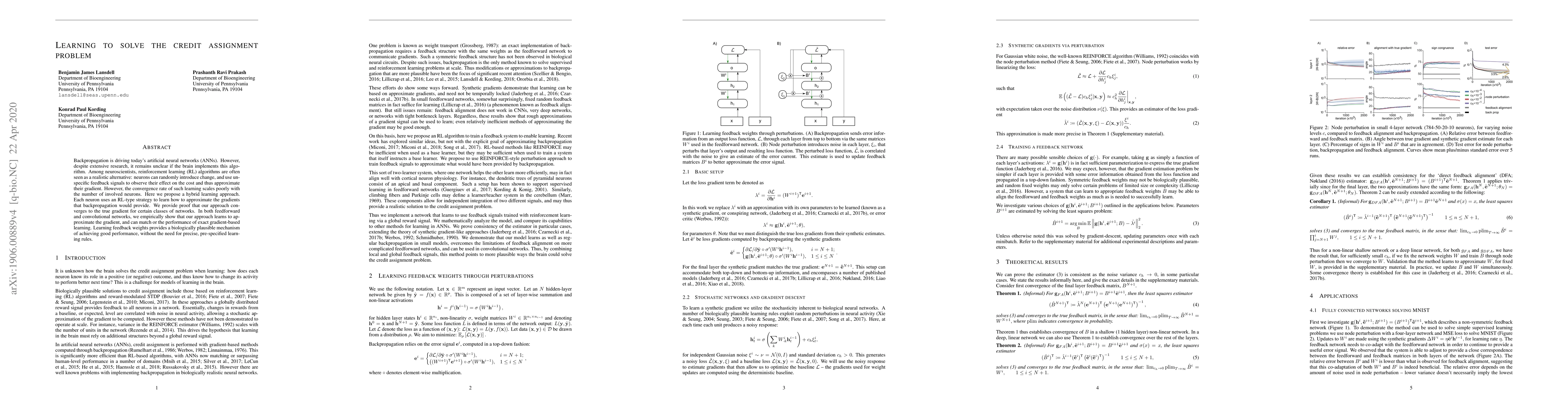 Backpropagation is driving today's artificial neural networks (ANNs). However, despite extensive research, it remains unclear if the brain implements this algorithm. Among neuroscientists, reinforcement learning (RL) algorithms are often seen as a realistic alternative: neurons can randomly introduce change, and use unspecific feedback signals to observe their effect on the cost and thus approximate their gradient. However, the convergence rate of such learning scales poorly with the number of involved neurons. Here we propose a hybrid learning approach. Each neuron uses an RL-type strategy to learn how to approximate the gradients that backpropagation would provide. We provide proof that our approach converges to the true gradient for certain classes of networks. In both feedforward and convolutional networks, we empirically show that our approach learns to approximate the gradient, and can match or the performance of exact gradient-based learning. Learning feedback weights provides a biologically plausible mechanism of achieving good performance, without the need for precise, pre-specified learning rules.