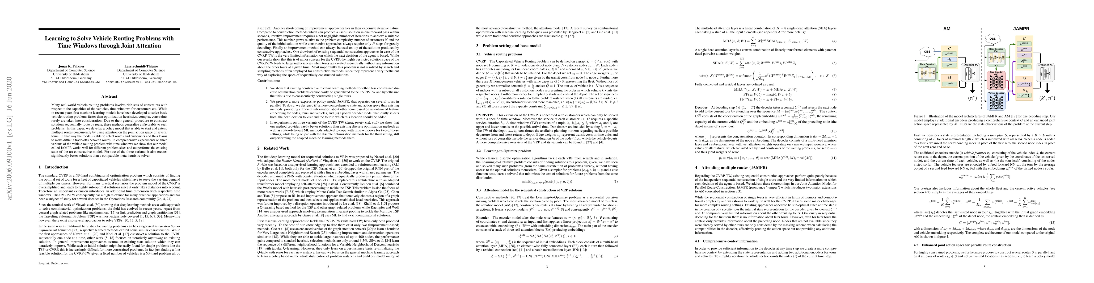 This paper introduces a policy model called JAMPR that uses joint attention to concurrently construct multiple vehicle routes, enabling it to handle complex constraints like time windows. Experiments demonstrate that JAMPR outperforms existing models and meta-heuristic solvers on various vehicle routing problems with time windows.