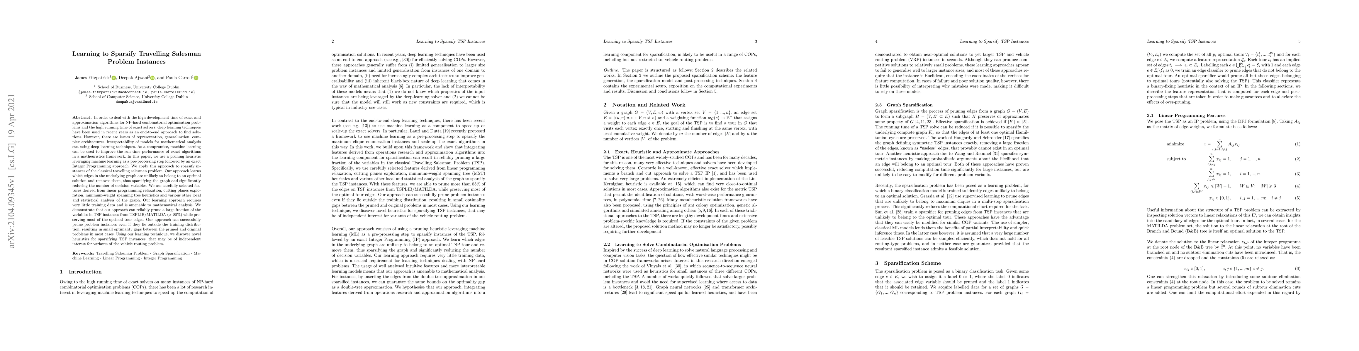 In order to deal with the high development time of exact and approximation algorithms for NP-hard combinatorial optimisation problems and the high running time of exact solvers, deep learning techniques have been used in recent years as an end-to-end approach to find solutions. However, there are issues of representation, generalisation, complex architectures, interpretability of models for mathematical analysis etc. using deep learning techniques. As a compromise, machine learning can be used to improve the run time performance of exact algorithms in a matheuristics framework. In this paper, we use a pruning heuristic leveraging machine learning as a pre-processing step followed by an exact Integer Programming approach. We apply this approach to sparsify instances of the classical travelling salesman problem. Our approach learns which edges in the underlying graph are unlikely to belong to an optimal solution and removes them, thus sparsifying the graph and significantly reducing the number of decision variables. We use carefully selected features derived from linear programming relaxation, cutting planes exploration, minimum-weight spanning tree heuristics and various other local and statistical analysis of the graph. Our learning approach requires very little training data and is amenable to mathematical analysis. We demonstrate that our approach can reliably prune a large fraction of the variables in TSP instances from TSPLIB/MATILDA (>85%$) while preserving most of the optimal tour edges. Our approach can successfully prune problem instances even if they lie outside the training distribution, resulting in small optimality gaps between the pruned and original problems in most cases. Using our learning technique, we discover novel heuristics for sparsifying TSP instances, that may be of independent interest for variants of the vehicle routing problem.