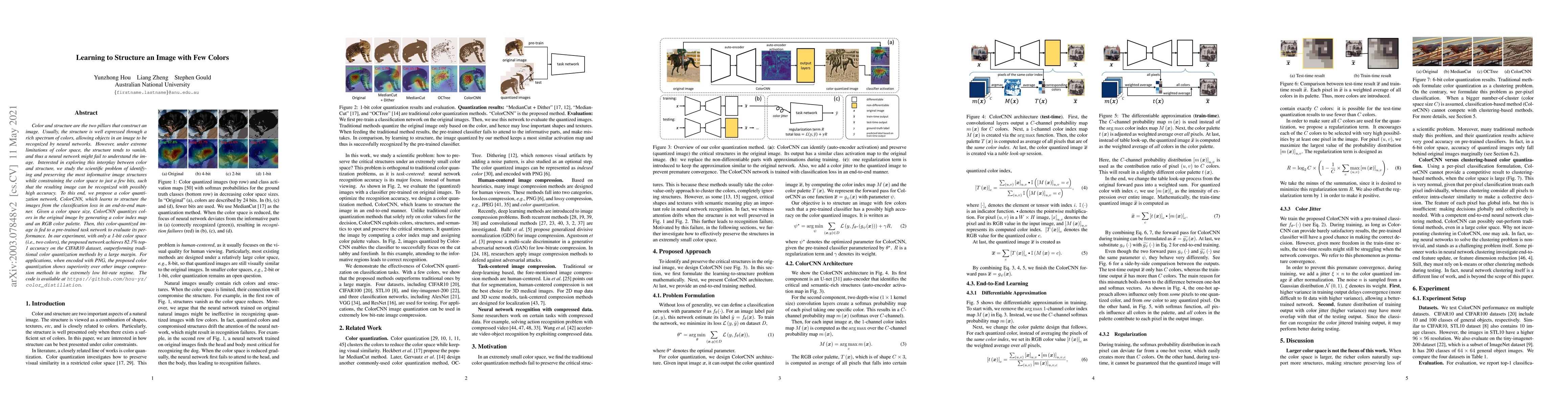 Color and structure are the two pillars that construct an image. Usually, the structure is well expressed through a rich spectrum of colors, allowing objects in an image to be recognized by neural networks. However, under extreme limitations of color space, the structure tends to vanish, and thus a neural network might fail to understand the image. Interested in exploring this interplay between color and structure, we study the scientific problem of identifying and preserving the most informative image structures while constraining the color space to just a few bits, such that the resulting image can be recognized with possibly high accuracy. To this end, we propose a color quantization network, ColorCNN, which learns to structure the images from the classification loss in an end-to-end manner. Given a color space size, ColorCNN quantizes colors in the original image by generating a color index map and an RGB color palette. Then, this color-quantized image is fed to a pre-trained task network to evaluate its performance. In our experiment, with only a 1-bit color space (i.e., two colors), the proposed network achieves 82.1% top-1 accuracy on the CIFAR10 dataset, outperforming traditional color quantization methods by a large margin. For applications, when encoded with PNG, the proposed color quantization shows superiority over other image compression methods in the extremely low bit-rate regime. The code is available at: https://github.com/hou-yz/color_distillation.