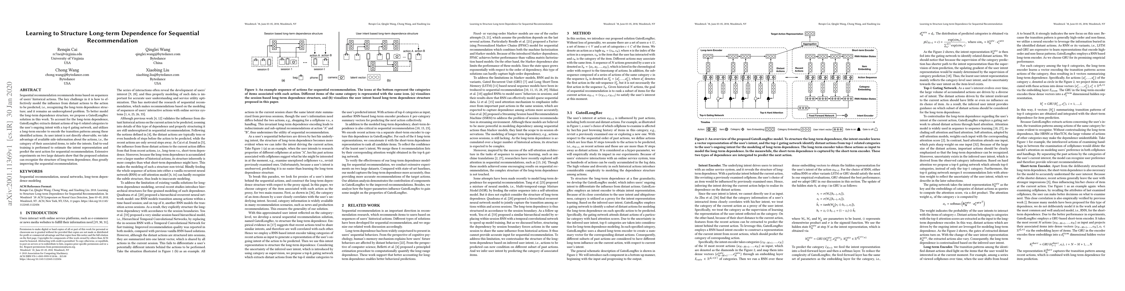 Sequential recommendation recommends items based on sequences of users' historical actions. The key challenge in it is how to effectively model the influence from distant actions to the action to be predicted, i.e., recognizing the long-term dependence structure; and it remains an underexplored problem. To better model the long-term dependence structure, we propose a GatedLongRec solution in this work. To account for the long-term dependence, GatedLongRec extracts distant actions of top-$k$ related categories to the user's ongoing intent with a top-$k$ gating network, and utilizes a long-term encoder to encode the transition patterns among these identified actions. As user intent is not directly observable, we take advantage of available side-information about the actions, i.e., the category of their associated items, to infer the intents. End-to-end training is performed to estimate the intent representation and predict the next action for sequential recommendation. Extensive experiments on two large datasets show that the proposed solution can recognize the structure of long-term dependence, thus greatly improving the sequential recommendation.