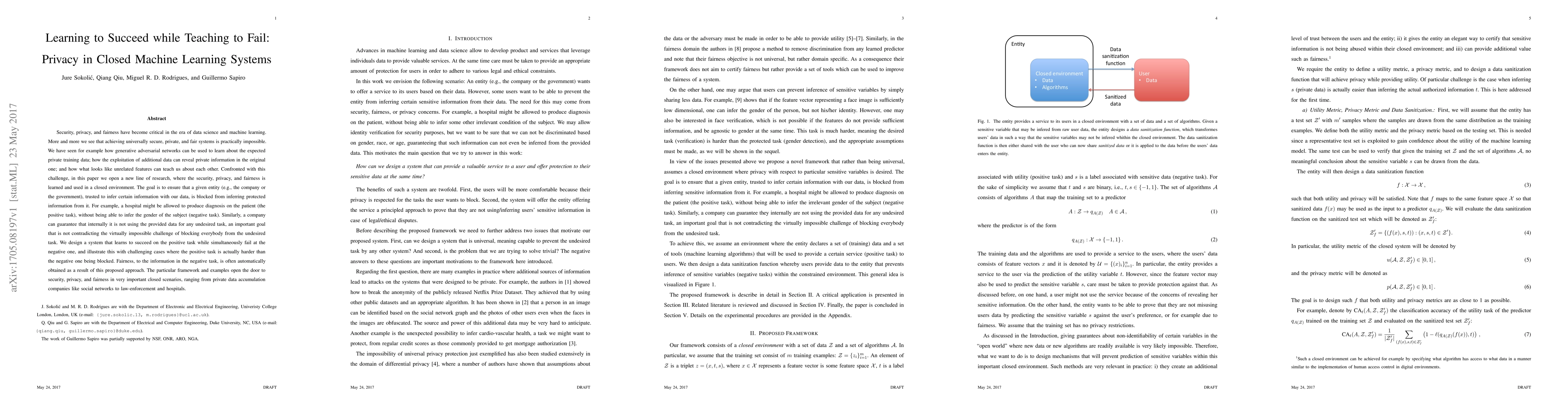 Security, privacy, and fairness have become critical in the era of data science and machine learning. More and more we see that achieving universally secure, private, and fair systems is practically impossible. We have seen for example how generative adversarial networks can be used to learn about the expected private training data; how the exploitation of additional data can reveal private information in the original one; and how what looks like unrelated features can teach us about each other. Confronted with this challenge, in this paper we open a new line of research, where the security, privacy, and fairness is learned and used in a closed environment. The goal is to ensure that a given entity (e.g., the company or the government), trusted to infer certain information with our data, is blocked from inferring protected information from it. For example, a hospital might be allowed to produce diagnosis on the patient (the positive task), without being able to infer the gender of the subject (negative task). Similarly, a company can guarantee that internally it is not using the provided data for any undesired task, an important goal that is not contradicting the virtually impossible challenge of blocking everybody from the undesired task. We design a system that learns to succeed on the positive task while simultaneously fail at the negative one, and illustrate this with challenging cases where the positive task is actually harder than the negative one being blocked. Fairness, to the information in the negative task, is often automatically obtained as a result of this proposed approach. The particular framework and examples open the door to security, privacy, and fairness in very important closed scenarios, ranging from private data accumulation companies like social networks to law-enforcement and hospitals.