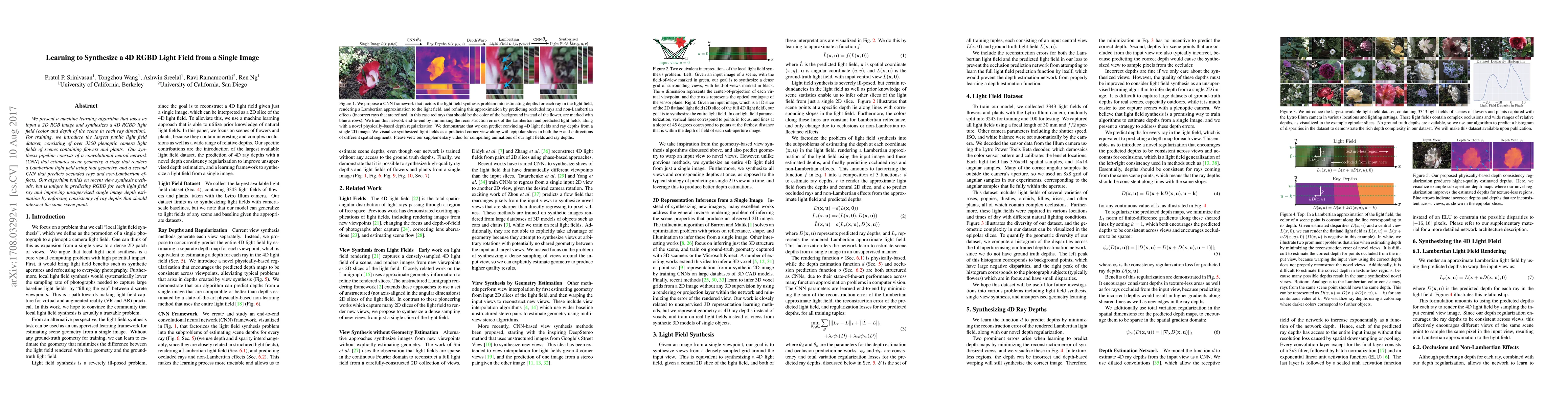 We present a machine learning algorithm that takes as input a 2D RGB image and synthesizes a 4D RGBD light field (color and depth of the scene in each ray direction). For training, we introduce the largest public light field dataset, consisting of over 3300 plenoptic camera light fields of scenes containing flowers and plants. Our synthesis pipeline consists of a convolutional neural network (CNN) that estimates scene geometry, a stage that renders a Lambertian light field using that geometry, and a second CNN that predicts occluded rays and non-Lambertian effects. Our algorithm builds on recent view synthesis methods, but is unique in predicting RGBD for each light field ray and improving unsupervised single image depth estimation by enforcing consistency of ray depths that should intersect the same scene point. Please see our supplementary video at https://youtu.be/yLCvWoQLnms
