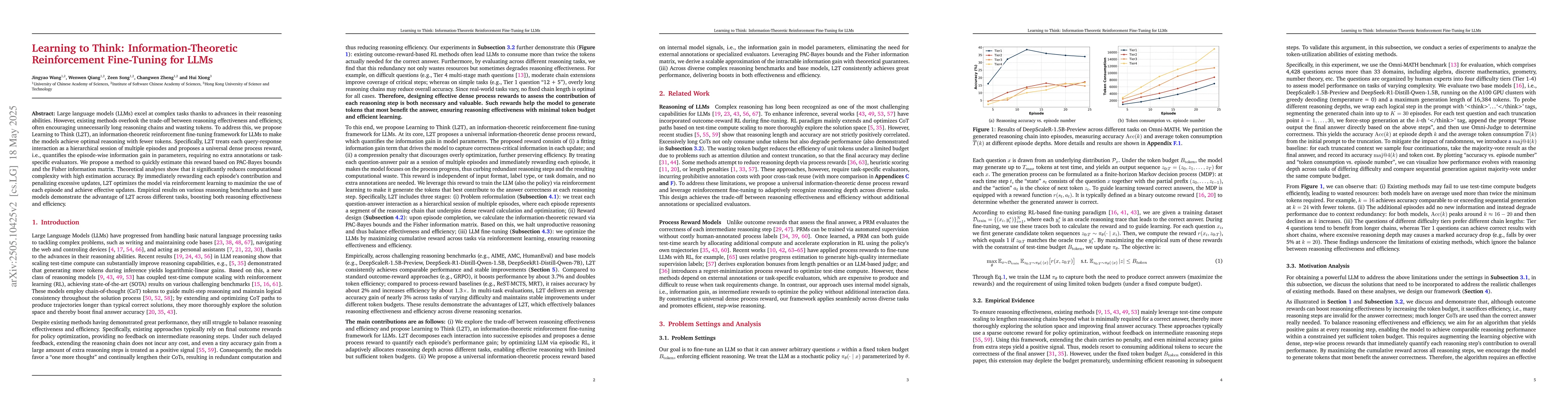 The research proposes Learning to Think (L2T), an information-theoretic reinforcement fine-tuning framework for LLMs. L2T treats each query-response interaction as a hierarchical session of multiple episodes and introduces a universal dense process reward based on episode-wise information gain in parameters, estimated using PAC-Bayes bounds and the Fisher information matrix.