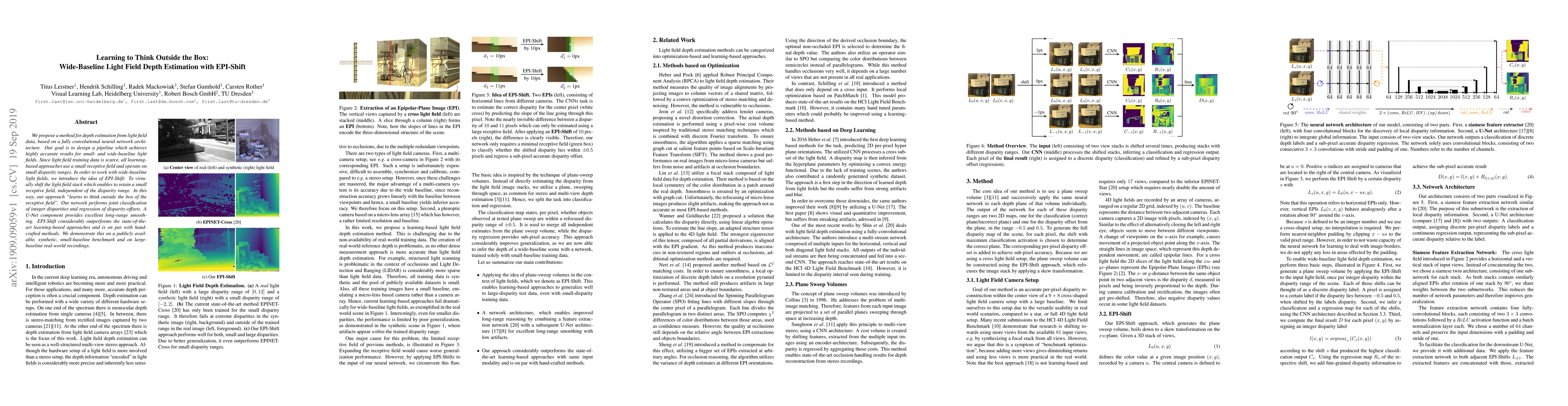 We propose a method for depth estimation from light field data, based on a fully convolutional neural network architecture. Our goal is to design a pipeline which achieves highly accurate results for small- and wide-baseline light fields. Since light field training data is scarce, all learning-based approaches use a small receptive field and operate on small disparity ranges. In order to work with wide-baseline light fields, we introduce the idea of EPI-Shift: To virtually shift the light field stack which enables to retain a small receptive field, independent of the disparity range. In this way, our approach "learns to think outside the box of the receptive field". Our network performs joint classification of integer disparities and regression of disparity-offsets. A U-Net component provides excellent long-range smoothing. EPI-Shift considerably outperforms the state-of-the-art learning-based approaches and is on par with hand-crafted methods. We demonstrate this on a publicly available, synthetic, small-baseline benchmark and on large-baseline real-world recordings.