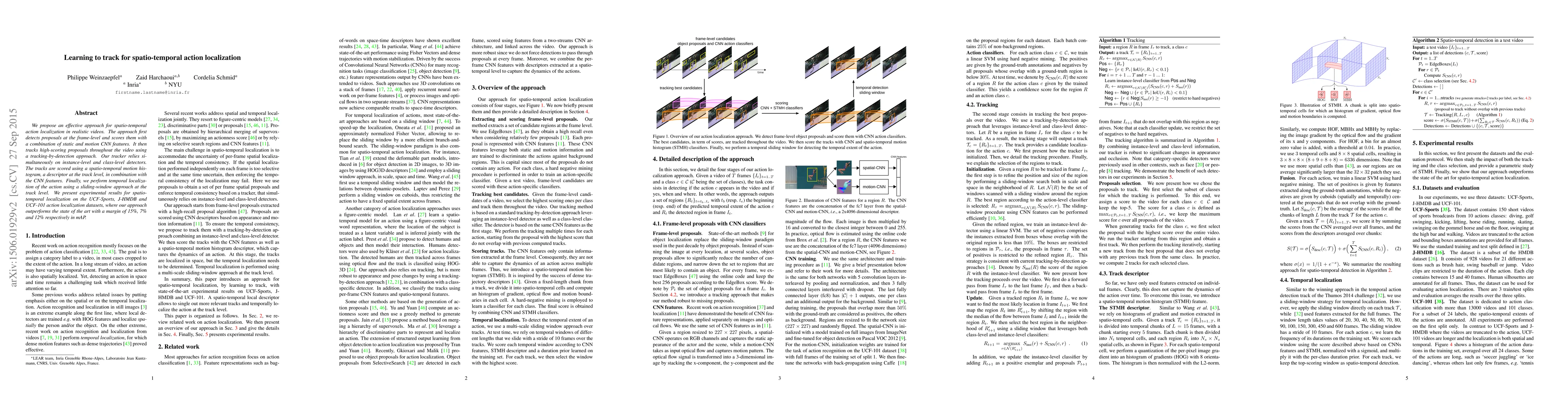 We propose an effective approach for spatio-temporal action localization in realistic videos. The approach first detects proposals at the frame-level and scores them with a combination of static and motion CNN features. It then tracks high-scoring proposals throughout the video using a tracking-by-detection approach. Our tracker relies simultaneously on instance-level and class-level detectors. The tracks are scored using a spatio-temporal motion histogram, a descriptor at the track level, in combination with the CNN features. Finally, we perform temporal localization of the action using a sliding-window approach at the track level. We present experimental results for spatio-temporal localization on the UCF-Sports, J-HMDB and UCF-101 action localization datasets, where our approach outperforms the state of the art with a margin of 15%, 7% and 12% respectively in mAP.