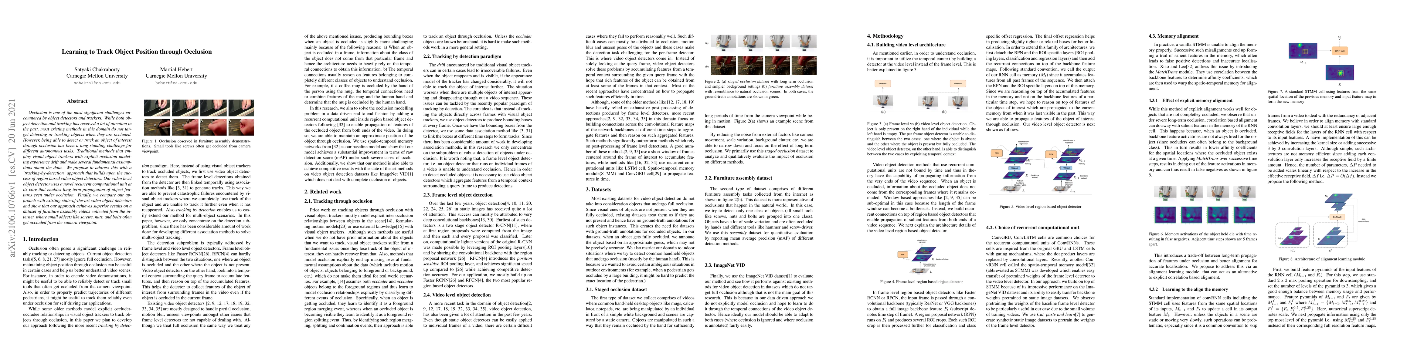 This paper proposes a novel "tracking-by-detection" approach using a recurrent computational unit to enhance object tracking through occlusion, achieving superior results compared to state-of-the-art methods on a dataset of furniture assembly videos.