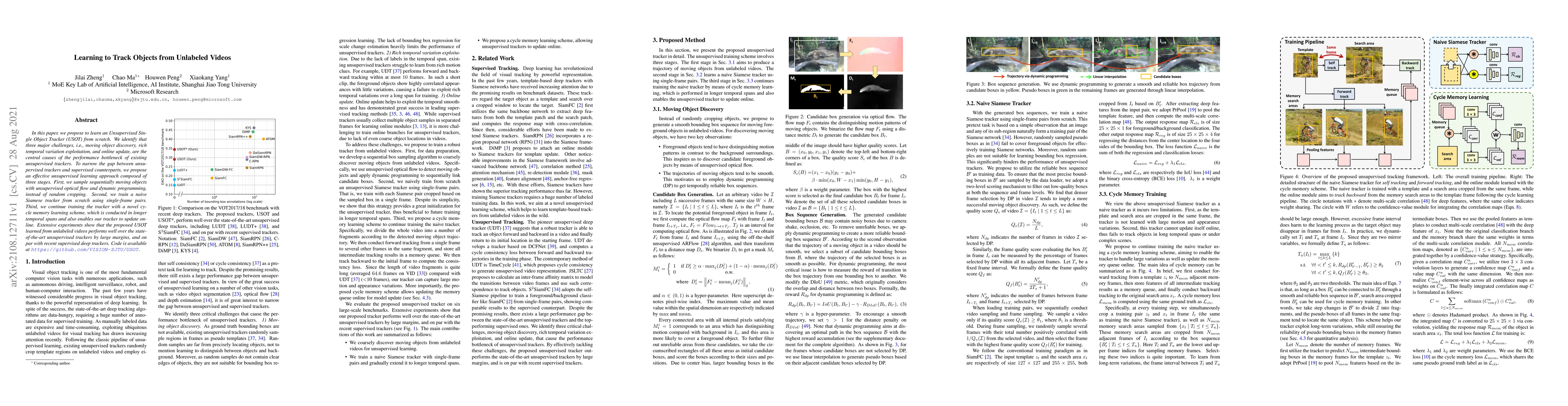 This paper introduces an Unsupervised Single Object Tracker (USOT) that learns from unlabeled videos, addressing challenges like object discovery, temporal variation, and online updates. The method involves sampling moving objects via optical flow, training a Siamese tracker, and employing a cycle memory learning scheme for continuous improvement. The proposed USOT outperforms existing unsupervised trackers and matches the performance of supervised deep trackers.