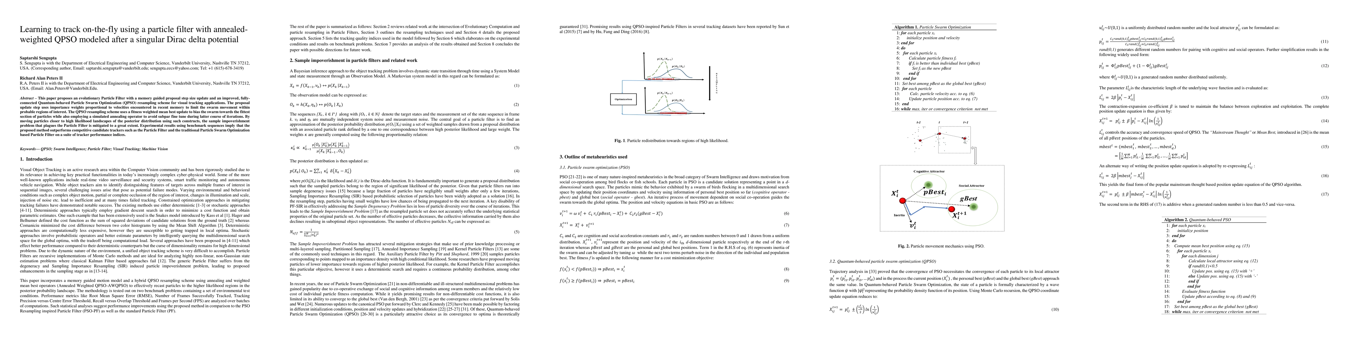 This paper proposes an evolutionary Particle Filter with a memory guided proposal step size update and an improved, fully-connected Quantum-behaved Particle Swarm Optimization (QPSO) resampling scheme for visual tracking applications. The proposal update step uses importance weights proportional to velocities encountered in recent memory to limit the swarm movement within probable regions of interest. The QPSO resampling scheme uses a fitness weighted mean best update to bias the swarm towards the fittest section of particles while also employing a simulated annealing operator to avoid subpar fine tune during latter course of iterations. By moving particles closer to high likelihood landscapes of the posterior distribution using such constructs, the sample impoverishment problem that plagues the Particle Filter is mitigated to a great extent. Experimental results using benchmark sequences imply that the proposed method outperforms competitive candidate trackers such as the Particle Filter and the traditional Particle Swarm Optimization based Particle Filter on a suite of tracker performance indices.