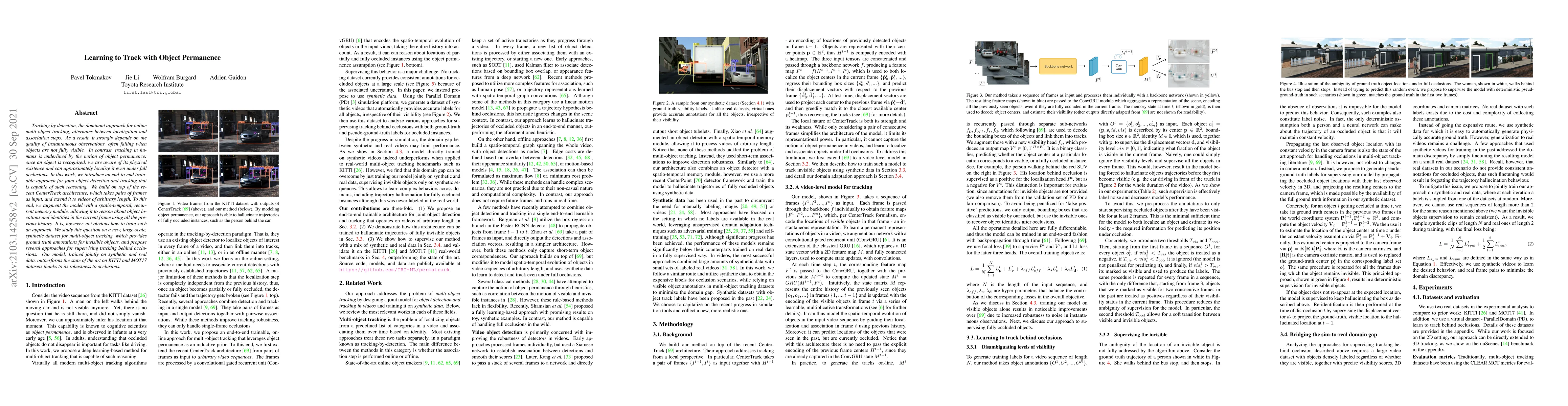 Tracking by detection, the dominant approach for online multi-object tracking, alternates between localization and association steps. As a result, it strongly depends on the quality of instantaneous observations, often failing when objects are not fully visible. In contrast, tracking in humans is underlined by the notion of object permanence: once an object is recognized, we are aware of its physical existence and can approximately localize it even under full occlusions. In this work, we introduce an end-to-end trainable approach for joint object detection and tracking that is capable of such reasoning. We build on top of the recent CenterTrack architecture, which takes pairs of frames as input, and extend it to videos of arbitrary length. To this end, we augment the model with a spatio-temporal, recurrent memory module, allowing it to reason about object locations and identities in the current frame using all the previous history. It is, however, not obvious how to train such an approach. We study this question on a new, large-scale, synthetic dataset for multi-object tracking, which provides ground truth annotations for invisible objects, and propose several approaches for supervising tracking behind occlusions. Our model, trained jointly on synthetic and real data, outperforms the state of the art on KITTI and MOT17 datasets thanks to its robustness to occlusions.