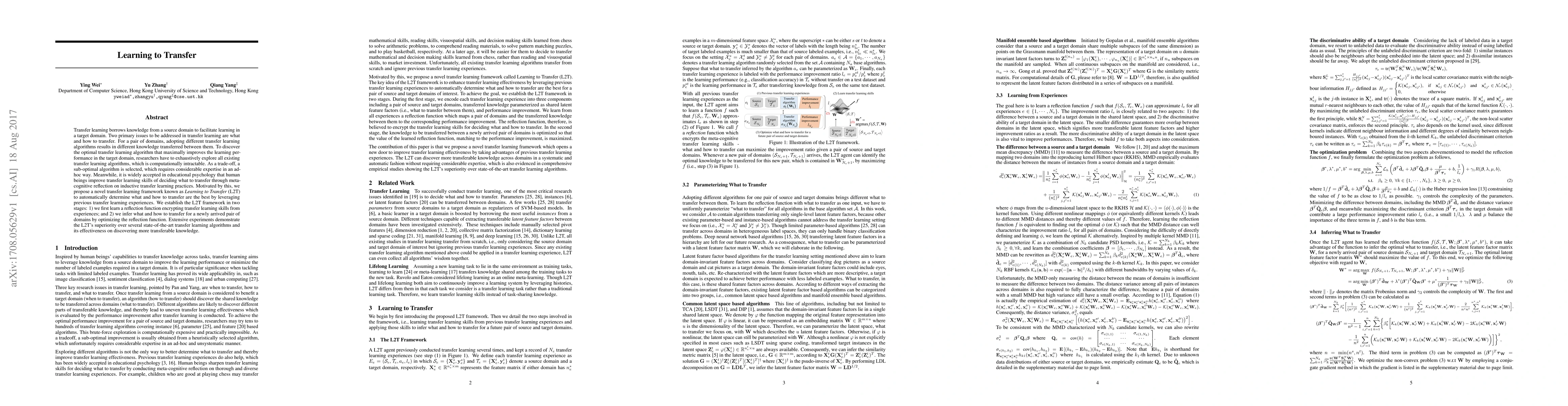 The paper proposes a novel Learning to Transfer (L2T) framework to automatically determine the optimal transfer learning algorithm by leveraging previous experiences. The L2T framework learns a reflection function from past transfer learning practices and optimizes it to infer the best transfer strategies for new domain pairs, demonstrating superior performance over existing algorithms.