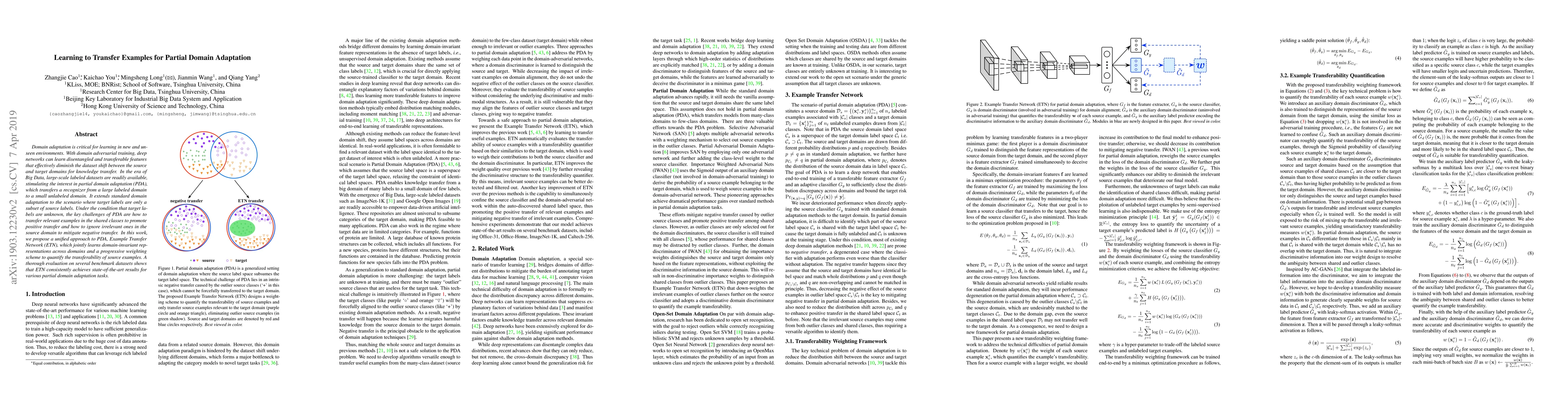 This work proposes an approach to partial domain adaptation (PDA) using an Example Transfer Network (ETN), which jointly learns domain-invariant representations across the source and target domains.
