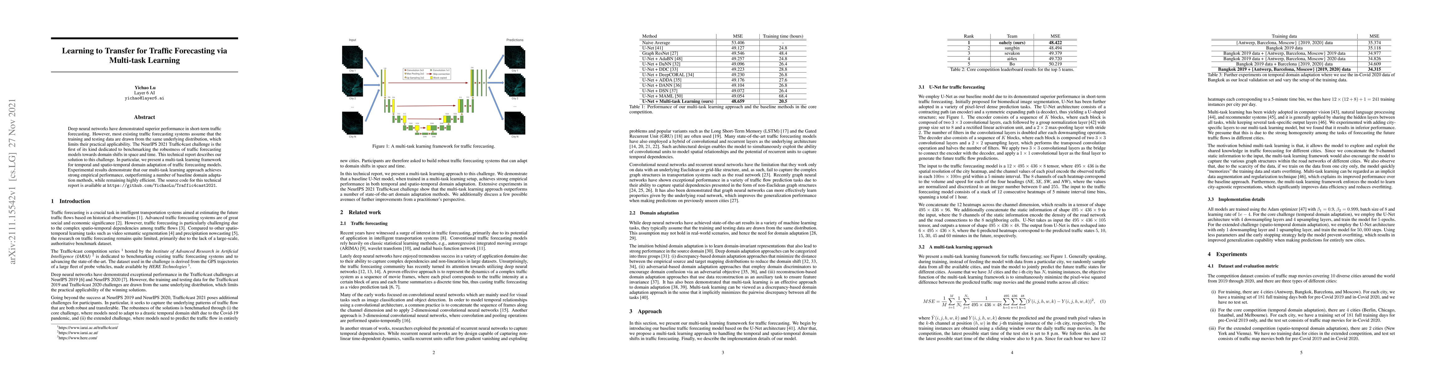 Deep neural networks have demonstrated superior performance in short-term traffic forecasting. However, most existing traffic forecasting systems assume that the training and testing data are drawn from the same underlying distribution, which limits their practical applicability. The NeurIPS 2021 Traffic4cast challenge is the first of its kind dedicated to benchmarking the robustness of traffic forecasting models towards domain shifts in space and time. This technical report describes our solution to this challenge. In particular, we present a multi-task learning framework for temporal and spatio-temporal domain adaptation of traffic forecasting models. Experimental results demonstrate that our multi-task learning approach achieves strong empirical performance, outperforming a number of baseline domain adaptation methods, while remaining highly efficient. The source code for this technical report is available at https://github.com/YichaoLu/Traffic4cast2021.