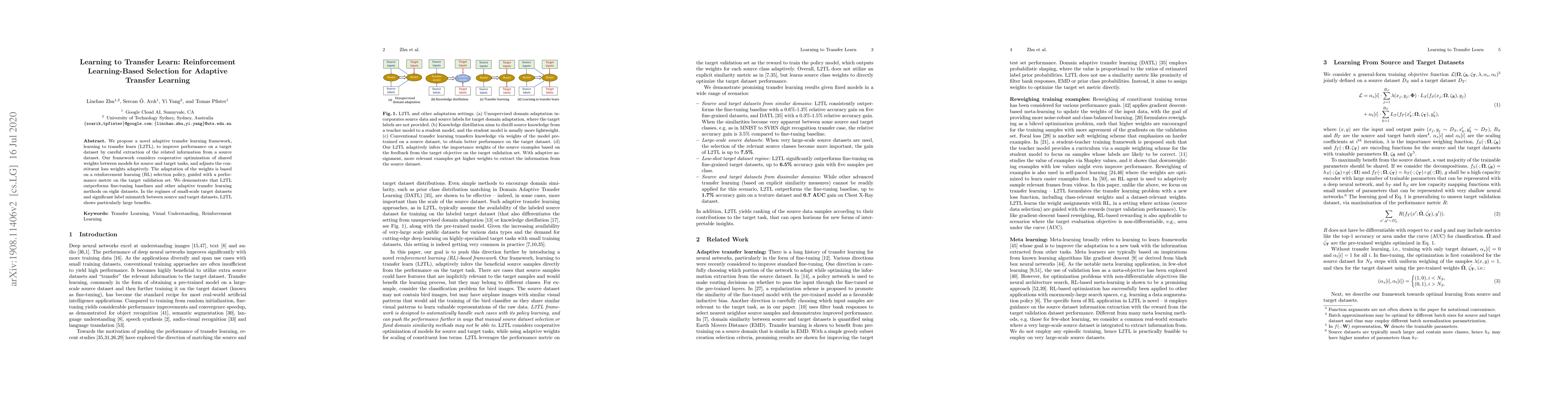 This paper introduces L2TL, an adaptive transfer learning framework that leverages reinforcement learning to optimize shared model weights between source and target tasks, dynamically adjusting loss weights based on target validation performance. The proposed method outperforms traditional fine-tuning and other adaptive transfer learning techniques, especially in scenarios with small target datasets and significant label mismatch.