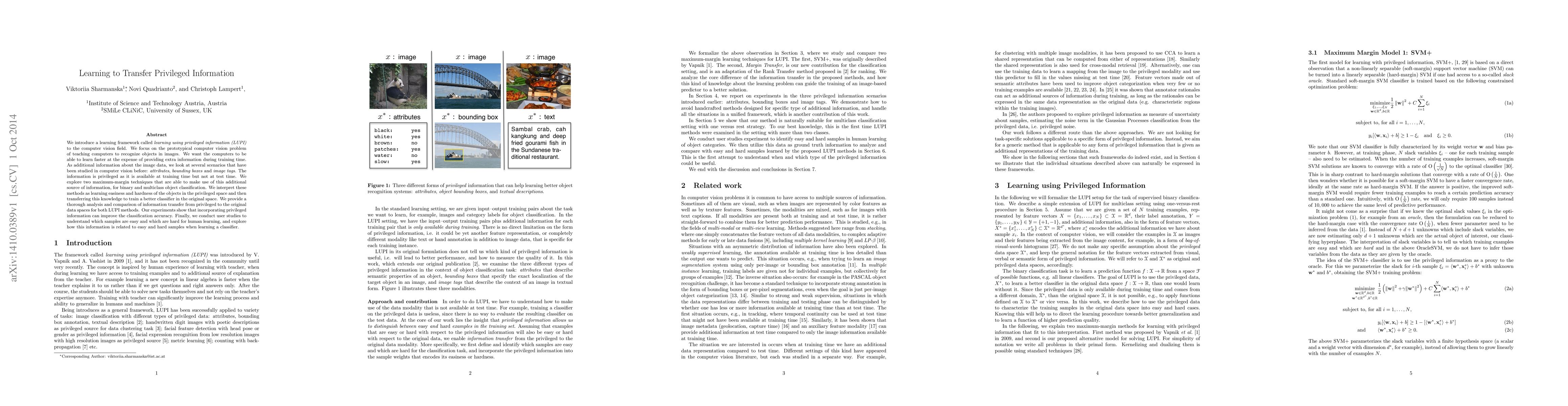 This paper introduces a learning framework called LUPI to leverage privileged information during training to improve object recognition in computer vision. The study explores maximum-margin techniques for binary and multiclass classification, demonstrating that using additional training-time-only information can enhance classification accuracy.
