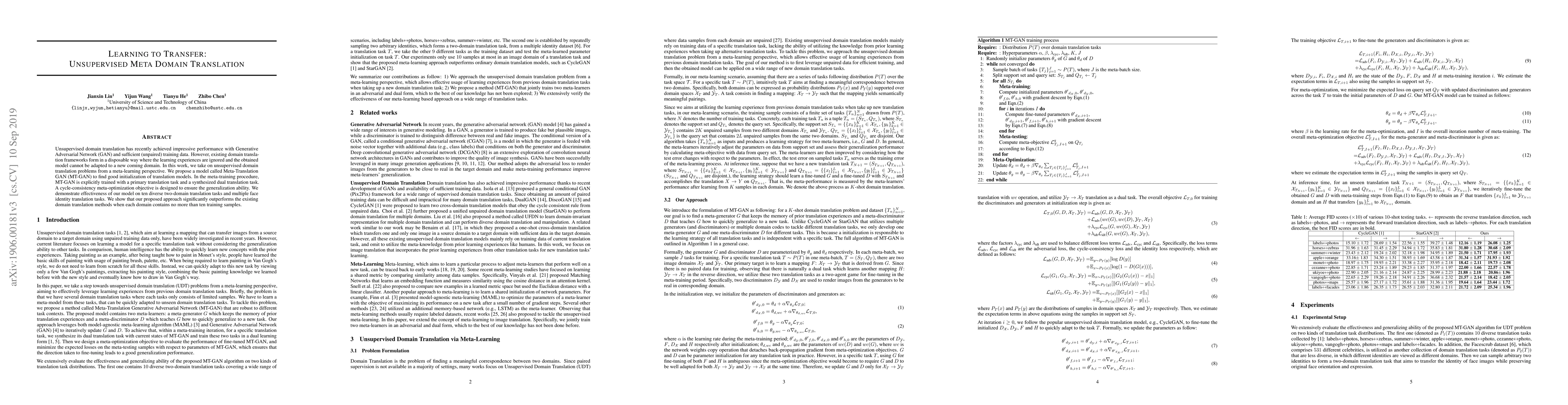 This paper introduces Meta-Translation GAN (MT-GAN), a meta-learning approach for unsupervised domain translation that improves model adaptability to new domains. The model outperforms existing methods, especially with limited training samples, through a cycle-consistency meta-optimization objective and dual translation tasks during meta-training.