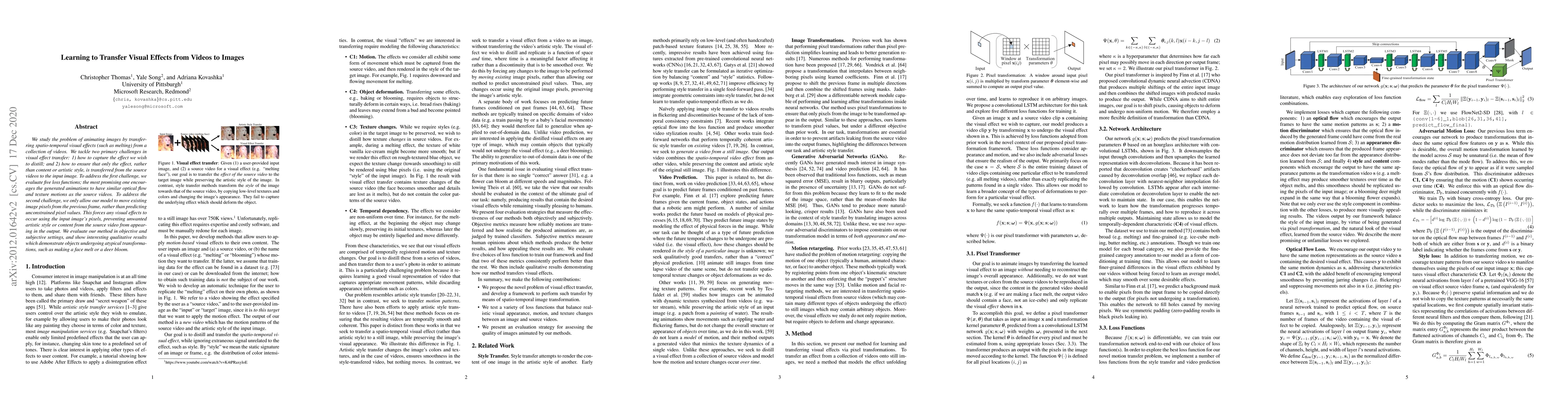 We study the problem of animating images by transferring spatio-temporal visual effects (such as melting) from a collection of videos. We tackle two primary challenges in visual effect transfer: 1) how to capture the effect we wish to distill; and 2) how to ensure that only the effect, rather than content or artistic style, is transferred from the source videos to the input image. To address the first challenge, we evaluate five loss functions; the most promising one encourages the generated animations to have similar optical flow and texture motions as the source videos. To address the second challenge, we only allow our model to move existing image pixels from the previous frame, rather than predicting unconstrained pixel values. This forces any visual effects to occur using the input image's pixels, preventing unwanted artistic style or content from the source video from appearing in the output. We evaluate our method in objective and subjective settings, and show interesting qualitative results which demonstrate objects undergoing atypical transformations, such as making a face melt or a deer bloom.