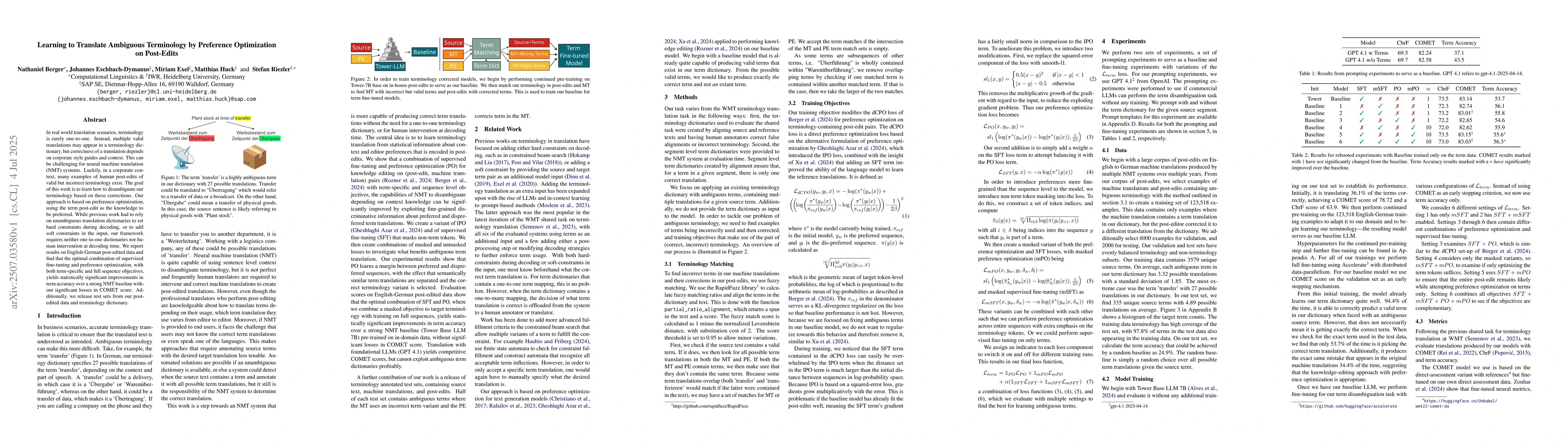 In real world translation scenarios, terminology is rarely one-to-one. Instead, multiple valid translations may appear in a terminology dictionary, but correctness of a translation depends on corporate style guides and context. This can be challenging for neural machine translation (NMT) systems. Luckily, in a corporate context, many examples of human post-edits of valid but incorrect terminology exist. The goal of this work is to learn how to disambiguate our terminology based on these corrections. Our approach is based on preference optimization, using the term post-edit as the knowledge to be preferred. While previous work had to rely on unambiguous translation dictionaries to set hard constraints during decoding, or to add soft constraints in the input, our framework requires neither one-to-one dictionaries nor human intervention at decoding time. We report results on English-German post-edited data and find that the optimal combination of supervised fine-tuning and preference optimization, with both term-specific and full sequence objectives, yields statistically significant improvements in term accuracy over a strong NMT baseline without significant losses in COMET score. Additionally, we release test sets from our post-edited data and terminology dictionary.