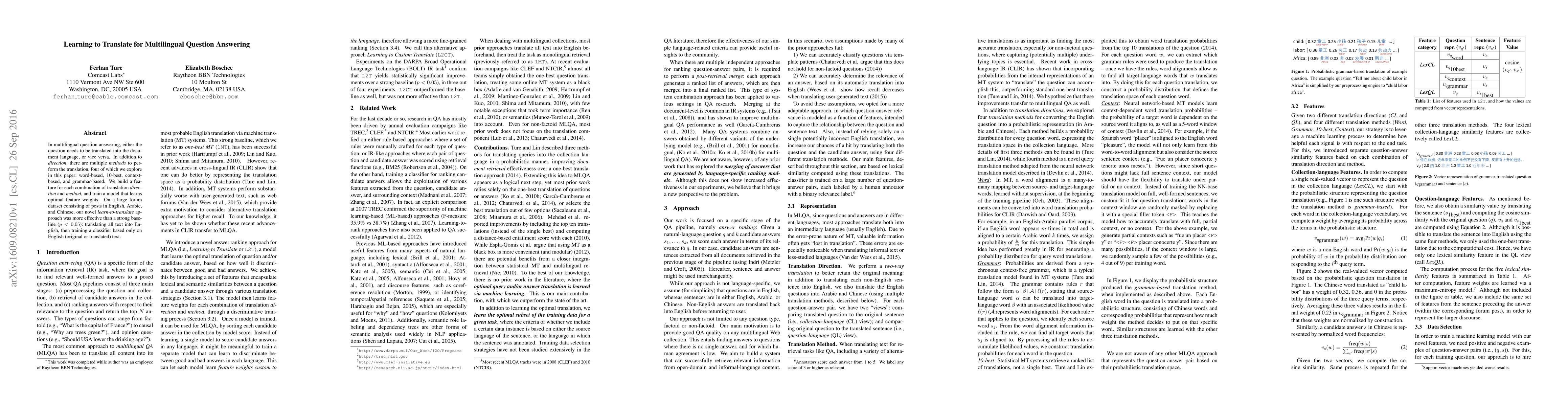 A novel approach to multilingual question answering is presented, using a learn-to-translate method that outperforms a baseline on a large forum dataset. This method combines translation methods and direction to improve accuracy in translating questions and answers between English, Arabic, and Chinese languages.