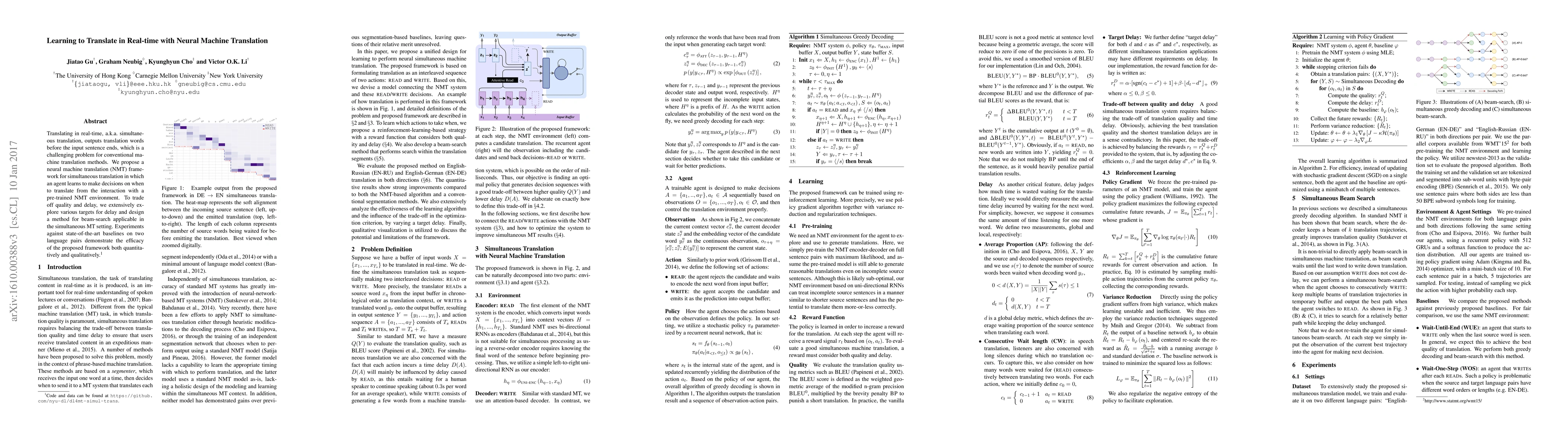 This paper proposes a neural machine translation framework for simultaneous translation, enabling real-time translation by learning to decide when to output translations. The method balances translation quality and delay through adaptive beam-search, outperforming state-of-the-art baselines in experiments on two language pairs.