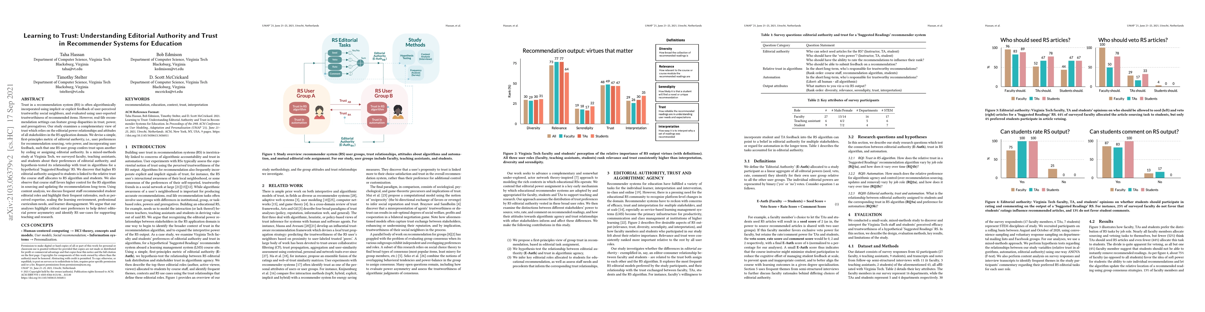This study explores how editorial authority and trust dynamics among faculty, teaching assistants, and students influence recommendation systems in educational contexts. Findings reveal that assigning editorial authority to students correlates with higher trust from course staff in the recommendation system, while staff prefer maintaining algorithmic control for long-term updates.