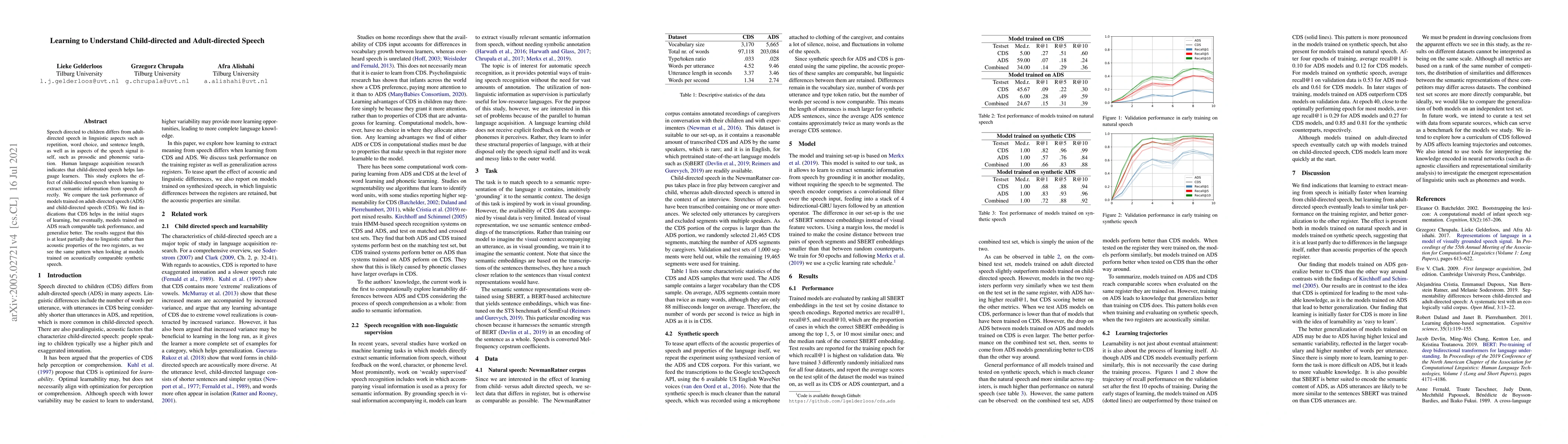 This study investigates how child-directed speech (CDS) aids in extracting semantic information compared to adult-directed speech (ADS). Initial learning benefits from CDS, but ADS-trained models eventually achieve comparable performance and better generalization. Linguistic properties, rather than acoustic differences, drive these outcomes.