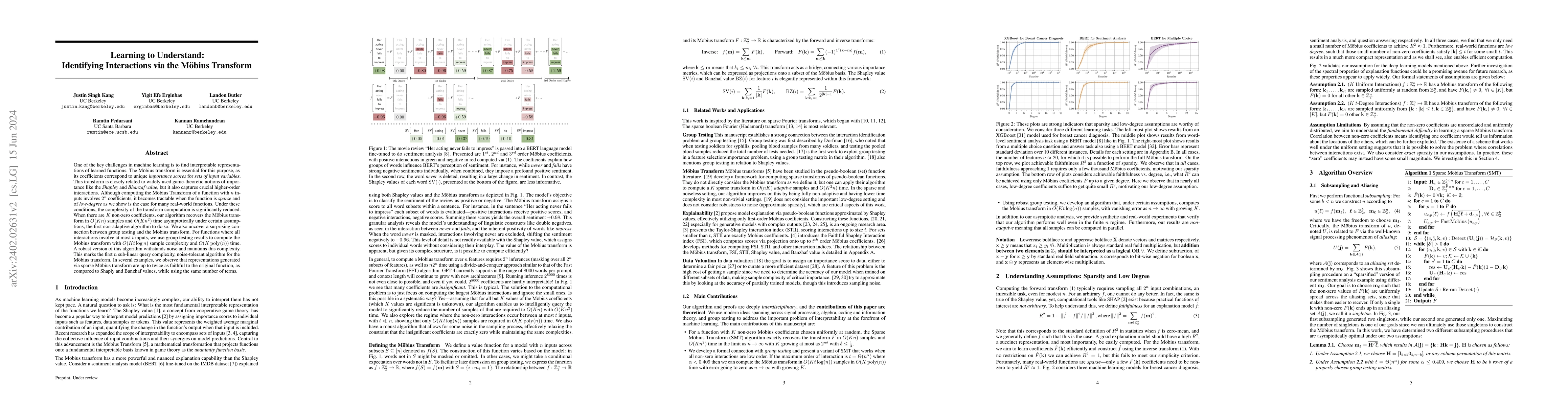 One of the key challenges in machine learning is to find interpretable representations of learned functions. The M\"obius transform is essential for this purpose, as its coefficients correspond to unique importance scores for sets of input variables. This transform is closely related to widely used game-theoretic notions of importance like the Shapley and Bhanzaf value, but it also captures crucial higher-order interactions. Although computing the obius Transform of a function with $n$ inputs involves $2^n$ coefficients, it becomes tractable when the function is sparse and of low-degree as we show is the case for many real-world functions. Under these conditions, the complexity of the transform computation is significantly reduced. When there are $K$ non-zero coefficients, our algorithm recovers the M\"obius transform in $O(Kn)$ samples and $O(Kn^2)$ time asymptotically under certain assumptions, the first non-adaptive algorithm to do so. We also uncover a surprising connection between group testing and the M\"obius transform. For functions where all interactions involve at most $t$ inputs, we use group testing results to compute the M\"obius transform with $O(Kt\log n)$ sample complexity and $O(K\mathrm{poly}(n))$ time. A robust version of this algorithm withstands noise and maintains this complexity. This marks the first $n$ sub-linear query complexity, noise-tolerant algorithm for the M\"obius transform. In several examples, we observe that representations generated via sparse M\"obius transform are up to twice as faithful to the original function, as compared to Shaply and Banzhaf values, while using the same number of terms.