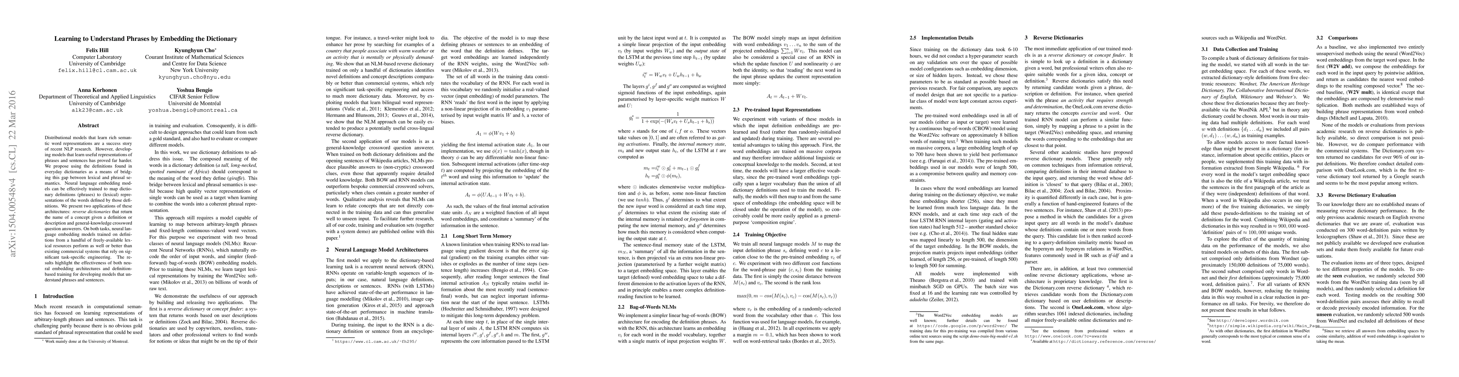 This paper proposes using dictionary definitions to train neural language models for understanding phrases, achieving competitive results on tasks like reverse dictionaries and crossword question answering. It demonstrates that leveraging dictionary-based training can bridge the gap between word and phrasal semantics effectively.