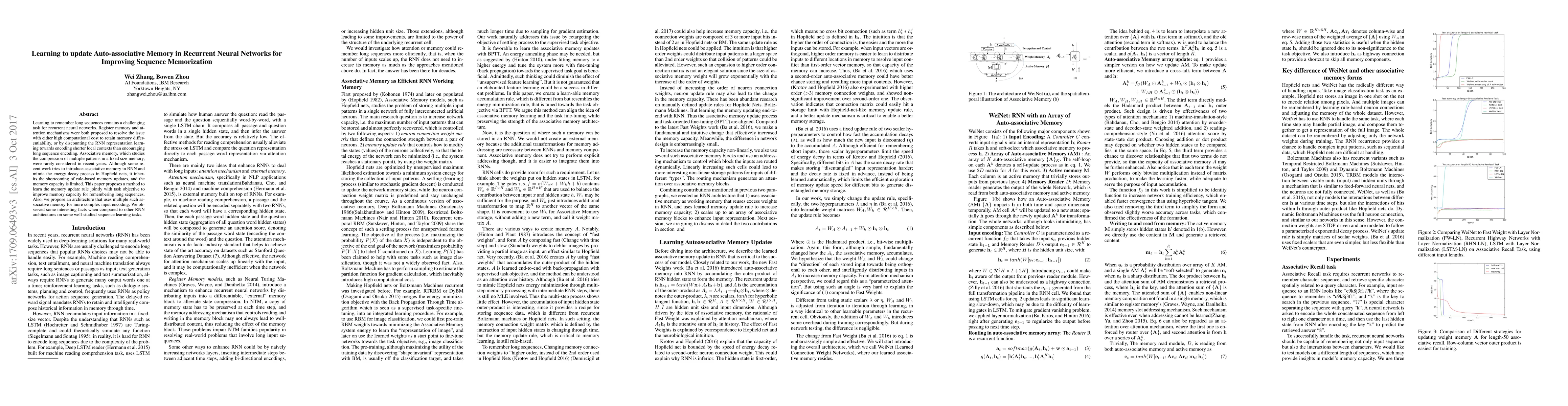 This paper proposes a method to learn adaptive memory update rules in recurrent neural networks to enhance sequence memorization, addressing the limitations of existing memory and attention mechanisms. The approach utilizes multiple associative memories to improve memory capacity and performance on sequence learning tasks.