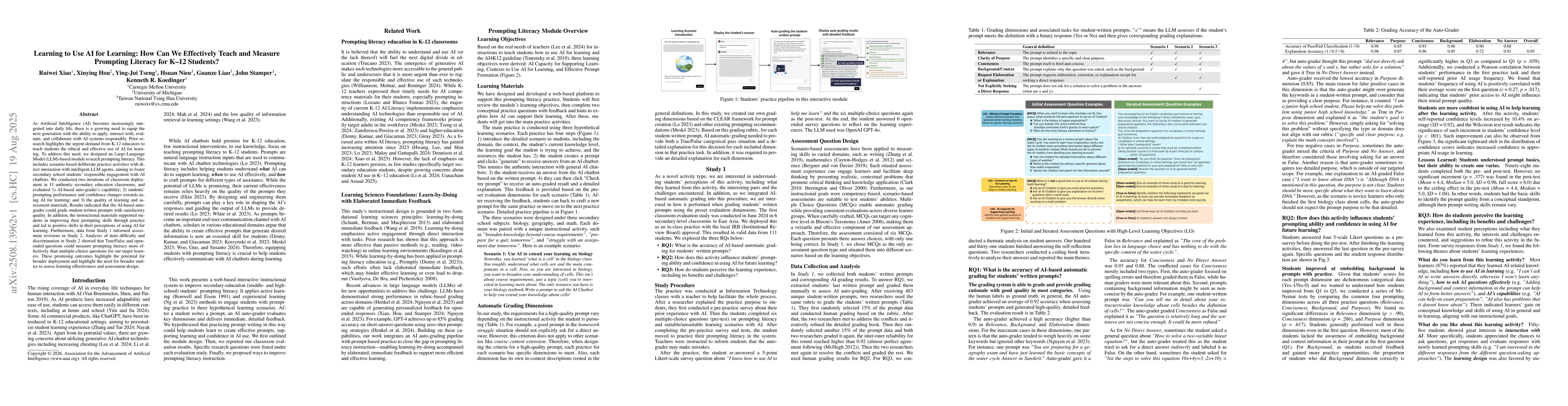 This study developed an AI-based module to teach K-12 students 'prompting literacy' for responsible AI interaction. Classroom trials showed AI could grade student prompts well, and the module improved students' prompting skills and positive attitudes towards AI learning. True/False and open-ended questions proved more effective for assessment than multiple-choice.