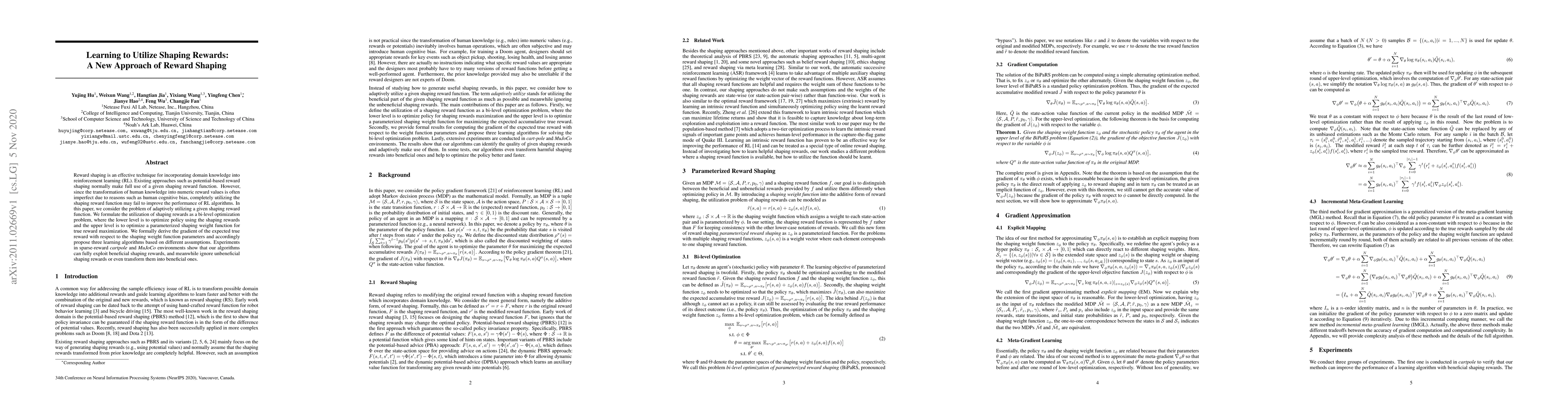 This paper proposes a new approach for adaptively utilizing shaping rewards in reinforcement learning, framing it as a bi-level optimization problem. The algorithms developed can exploit beneficial shaping rewards while ignoring or transforming unbeneficial ones, improving RL performance in sparse-reward environments.