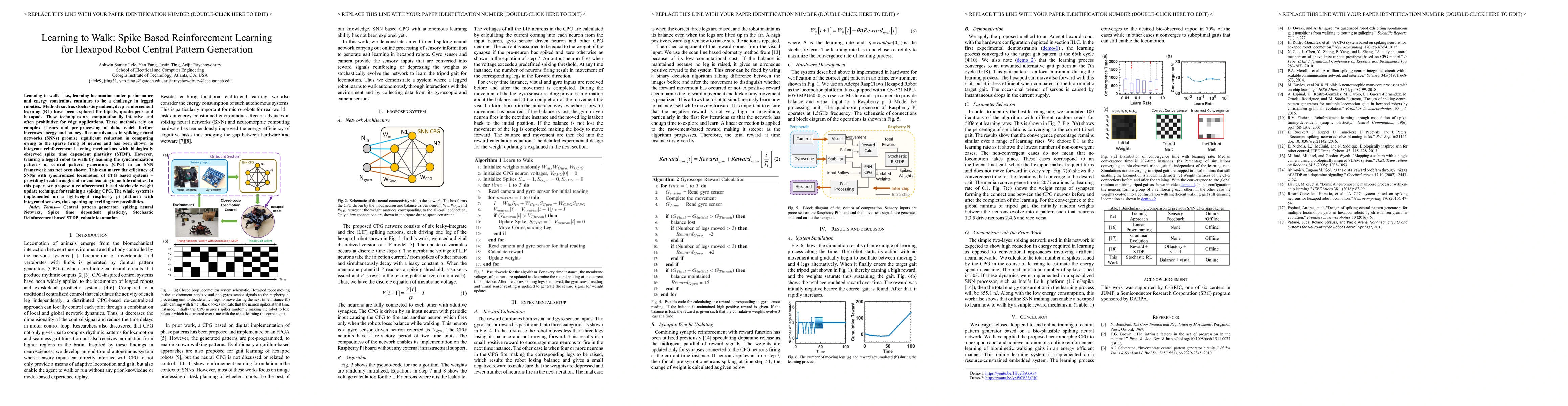 Learning to walk -- i.e., learning locomotion under performance and energy constraints continues to be a challenge in legged robotics. Methods such as stochastic gradient, deep reinforcement learning (RL) have been explored for bipeds, quadrupeds and hexapods. These techniques are computationally intensive and often prohibitive for edge applications. These methods rely on complex sensors and pre-processing of data, which further increases energy and latency. Recent advances in spiking neural networks (SNNs) promise a significant reduction in computing owing to the sparse firing of neuros and has been shown to integrate reinforcement learning mechanisms with biologically observed spike time dependent plasticity (STDP). However, training a legged robot to walk by learning the synchronization patterns of central pattern generators (CPG) in an SNN framework has not been shown. This can marry the efficiency of SNNs with synchronized locomotion of CPG based systems providing breakthrough end-to-end learning in mobile robotics. In this paper, we propose a reinforcement based stochastic weight update technique for training a spiking CPG. The whole system is implemented on a lightweight raspberry pi platform with integrated sensors, thus opening up exciting new possibilities.